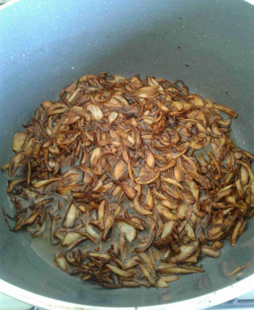 # أولاً : نفرم البصل جوانح ، ونقليه في زيت غزير إلى أن يصل للون البني الغامق ، ثم نقلي المكسرات بنفس الزيت ونضعه جانبا .