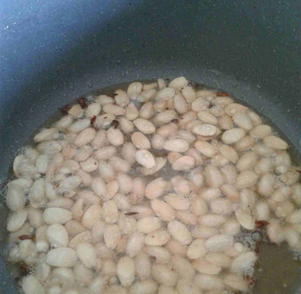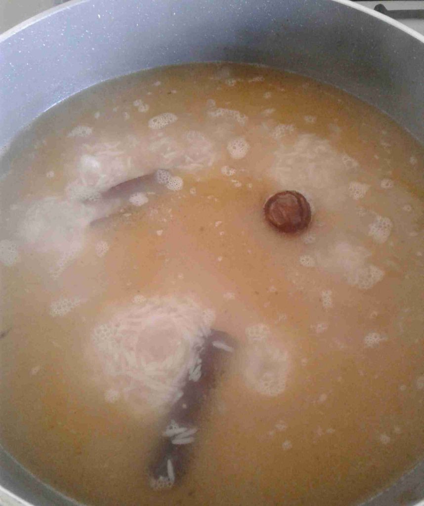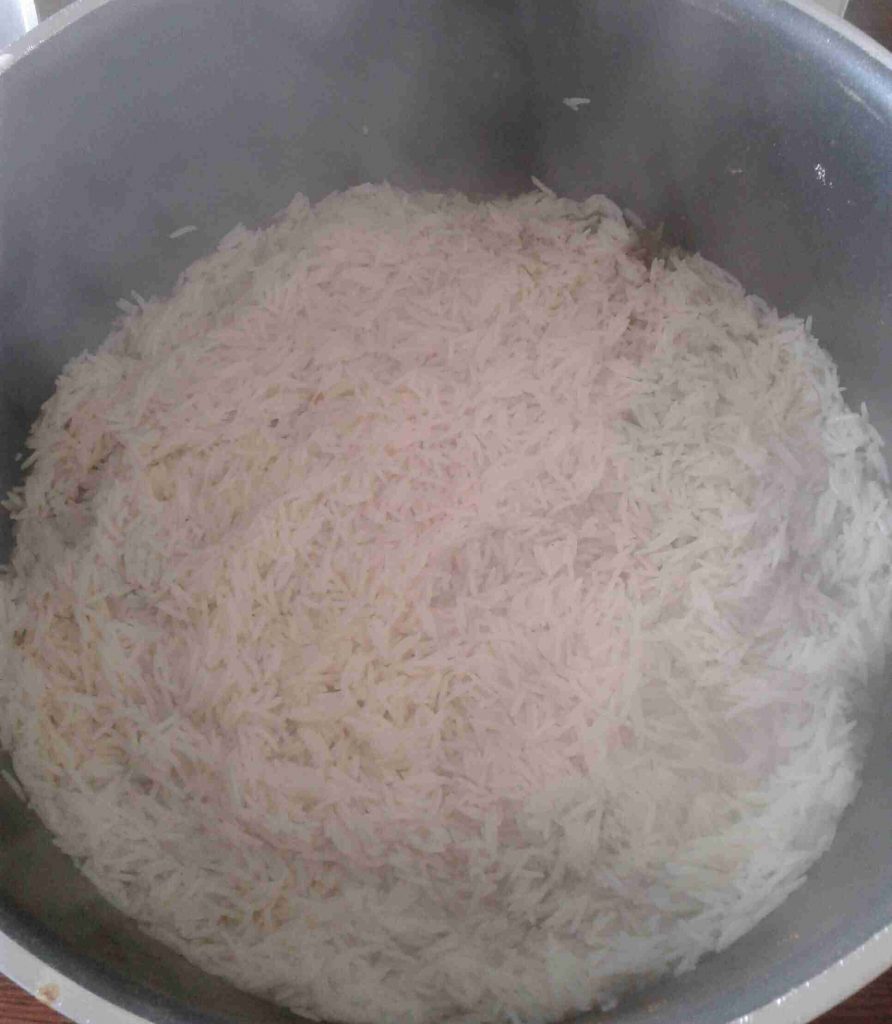 # خامساً : في وعاء على النار : نضع كمية من الماء (لسلق الأرز) ونتركها حتى الغليان ، ثم نضيف لها عود القرفة والهيل وحبة لومي والملح وكمية مناسبة من زيت البصل المقلي ، ونسقط عليها الأرز المنقوع والمصفى ، ونحرك ، ونتركها تغلي من (٥ – ٧) دقائق على نار عالية .