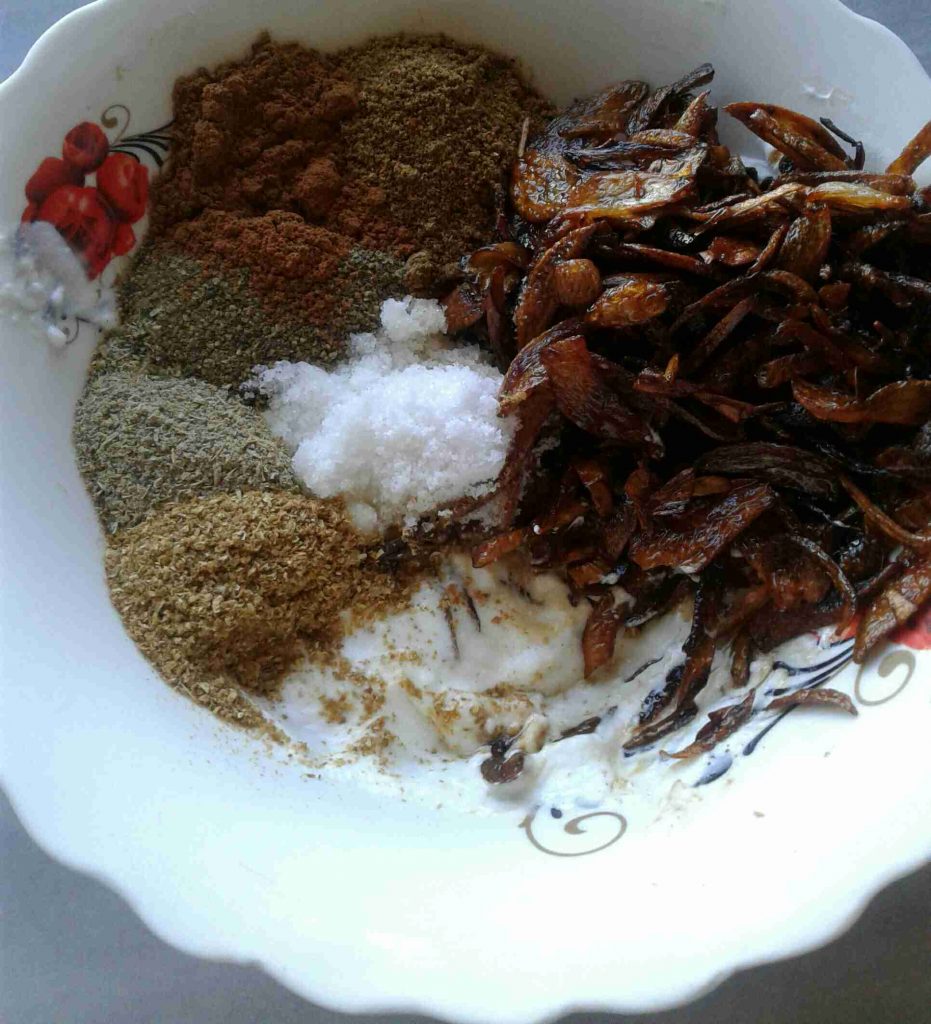 # ثانياً : في الخلاط : نضع (اللبن، والثوم، وجميع البهارات المطحونة، والملح، ونصف كمية البصل المقلي) ونخلط جيداً .