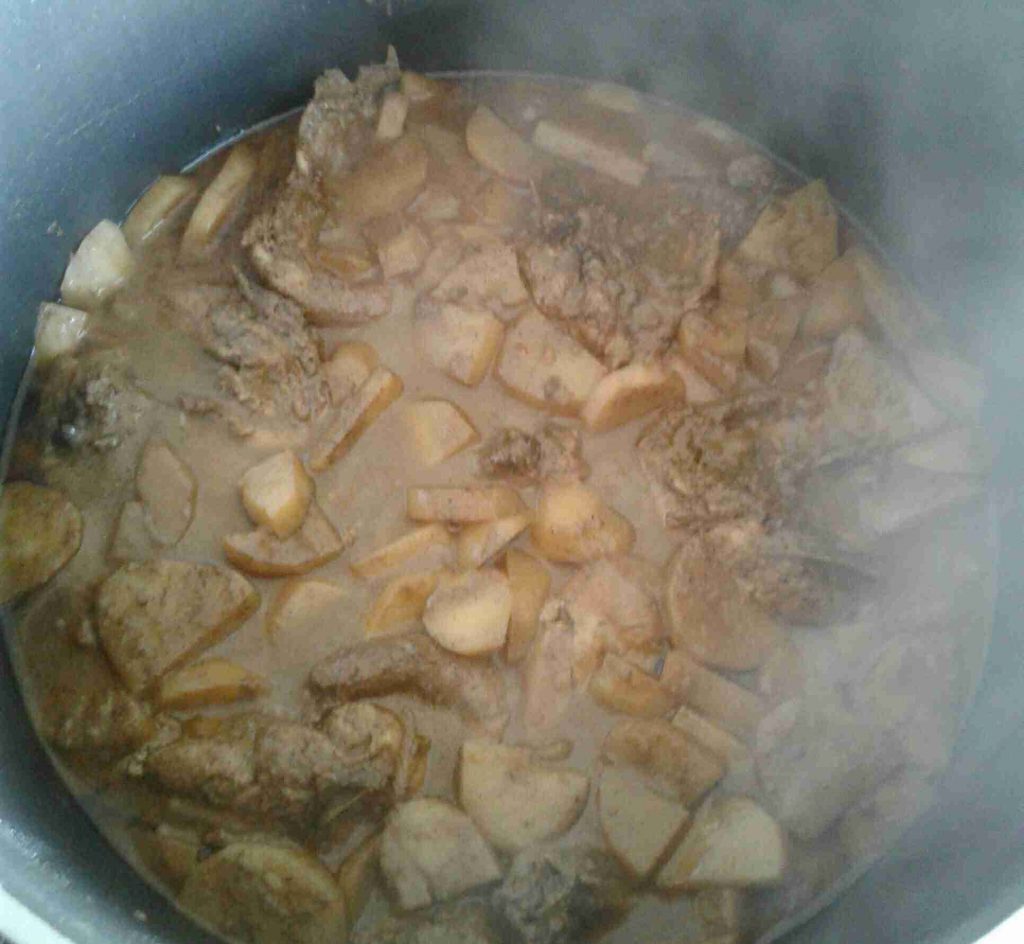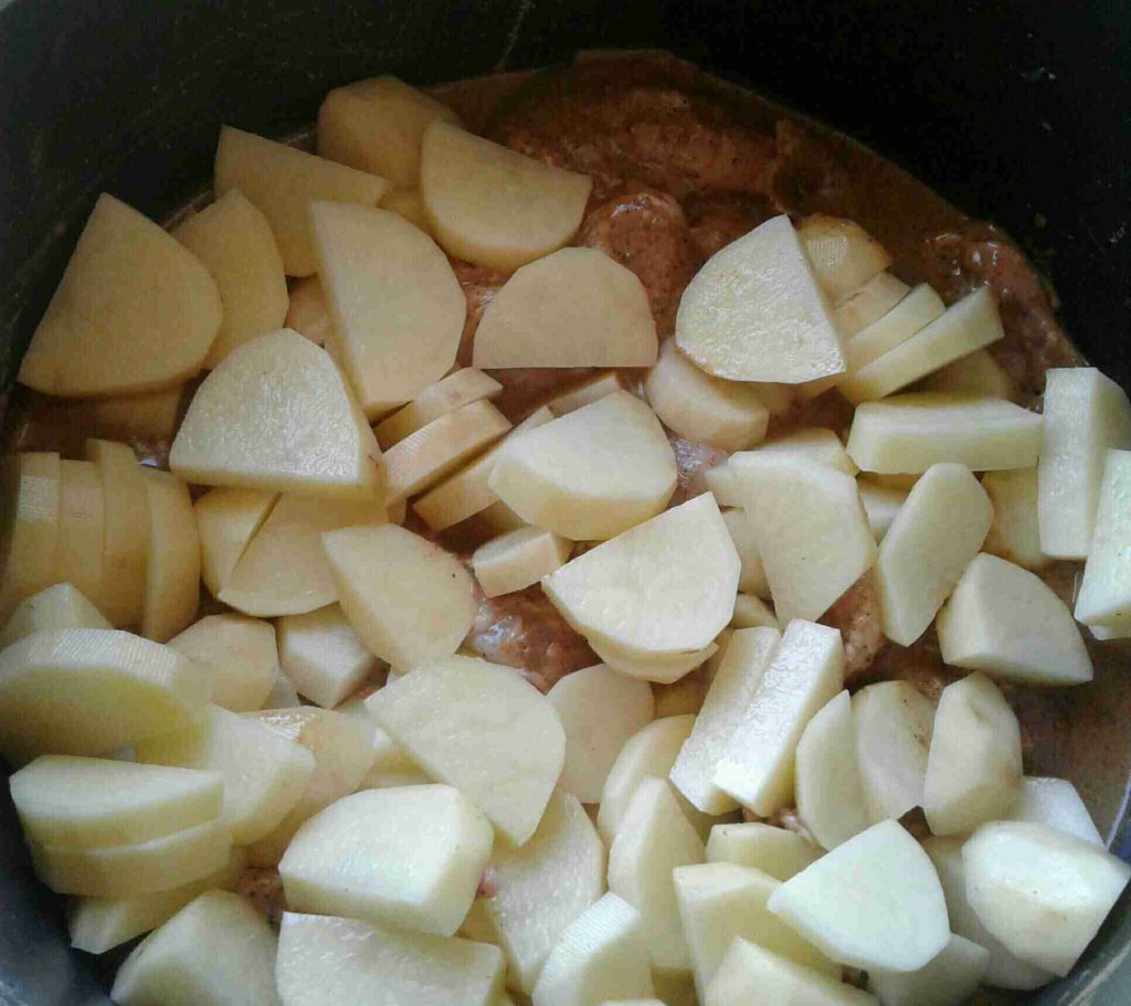 # رابعاً : في طنجرة على النار : نضغ كمية من زيت البصل المقلي ونسخنه ، ونشوح فيه الدجاج والبطاطا ، ثم ننزل عليها كل كمية التتبيلة ومن غير إضافة الماء نهائياً ، ونغطيها ، ونتركها على نار هادئة مدة نصف ساعة أو أكثر (حتى ينضج الدجاج والبطاطا) .