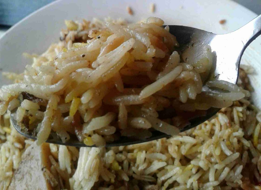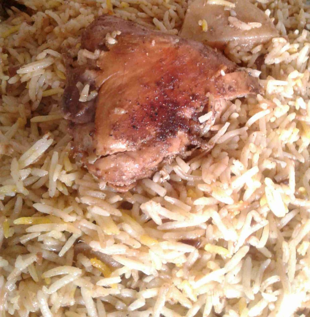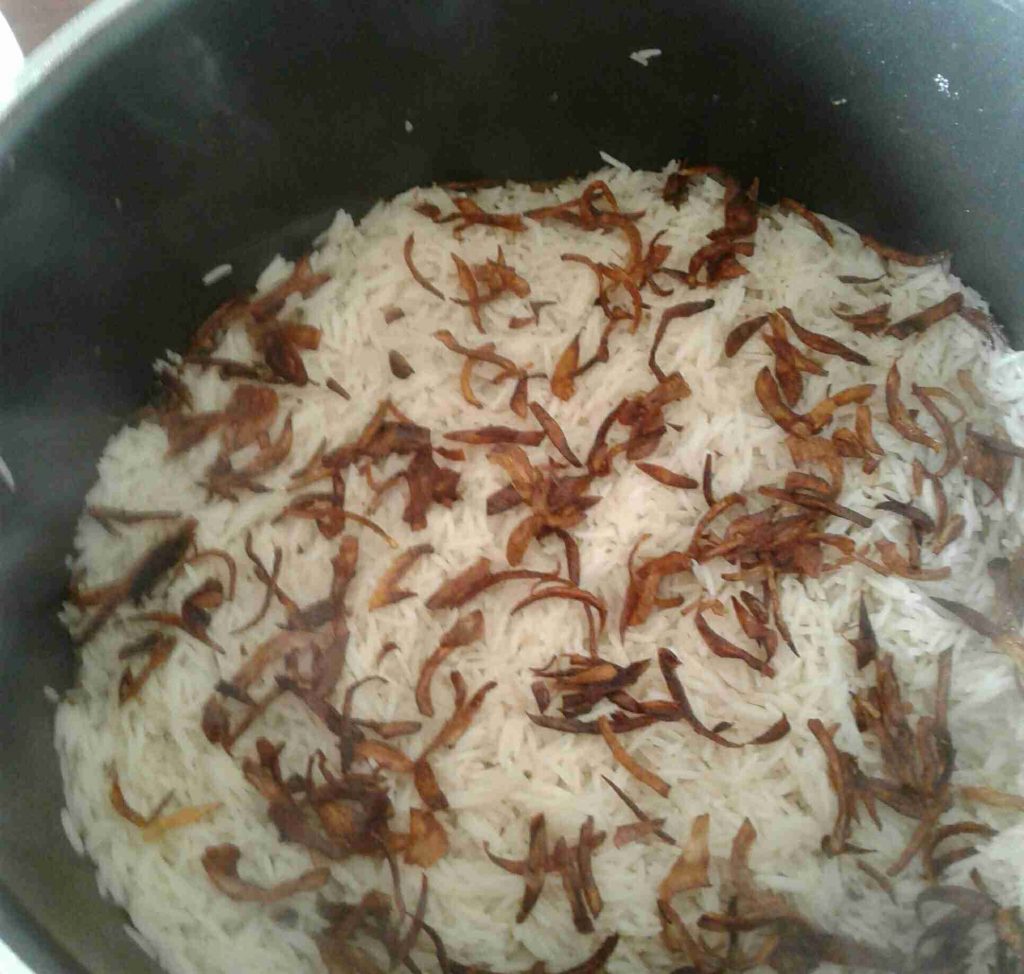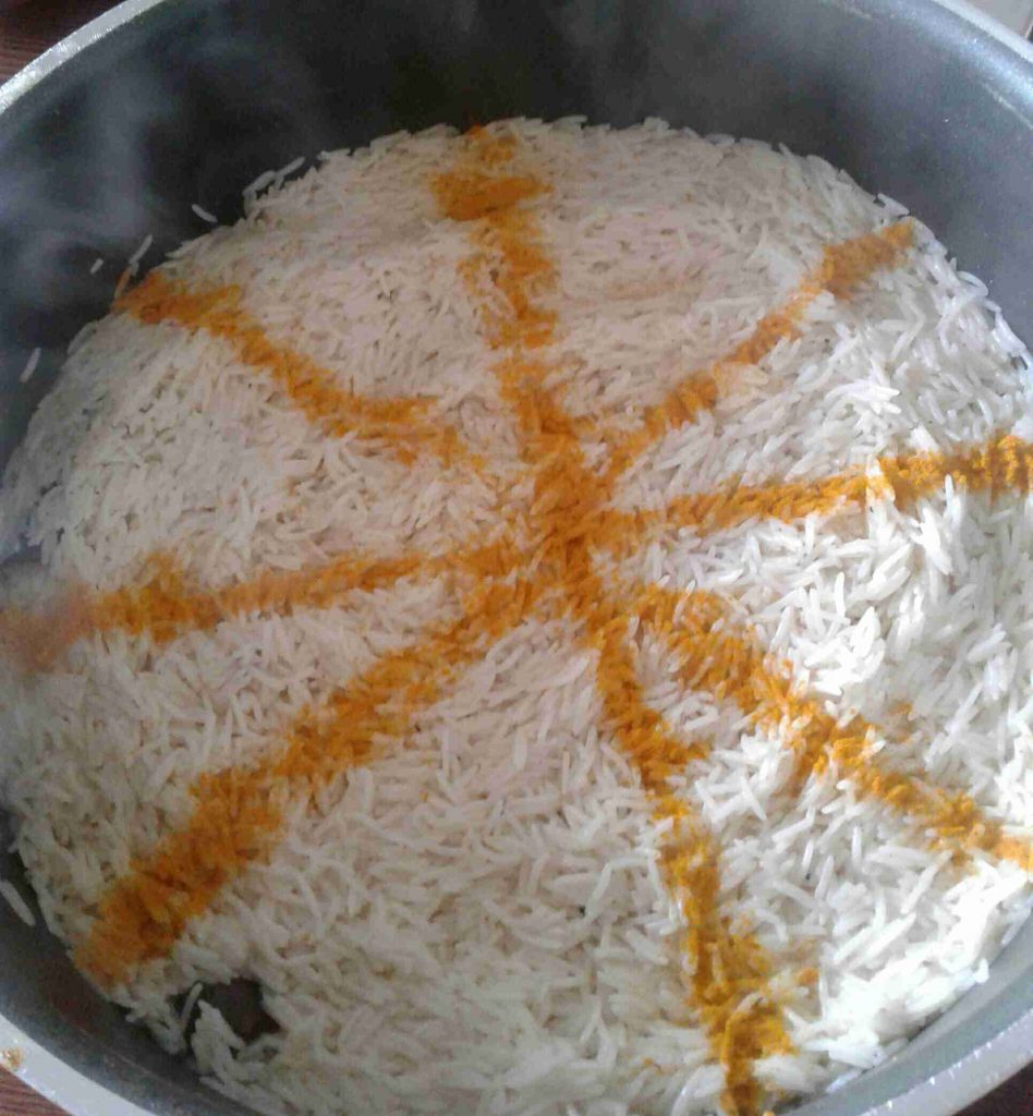 # سادساً : نصفي الأرز من الماء ونسقط نصف الكمية فوق الدجاج والبطاطا ، ثم طبقة من البصل المقلي ، ثم باقي الأرز ، ثم القليل من الكركم ، ونغطيها ، ونتركها على نار هادئة جداً مدة (٢٠) دقيقة.