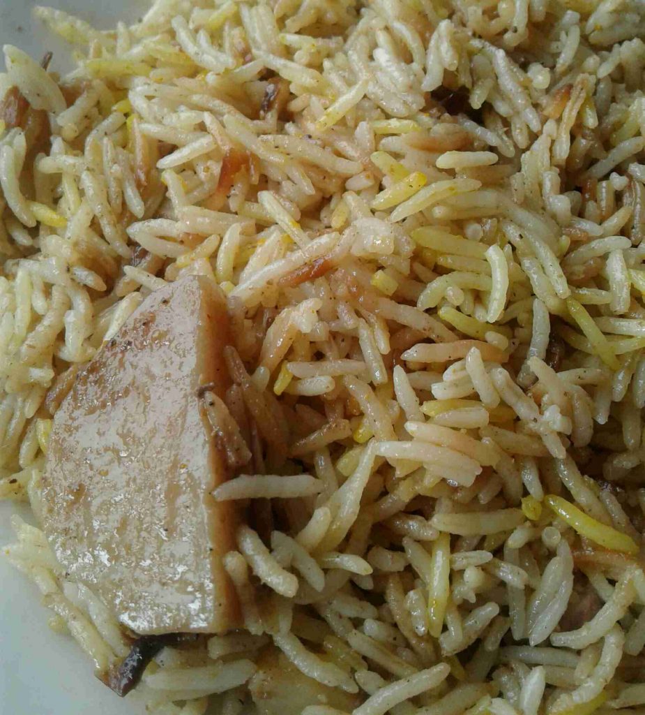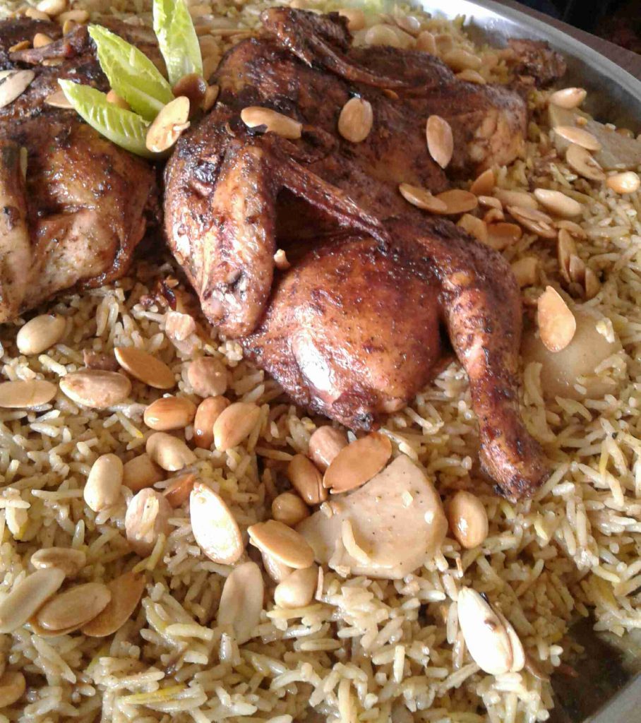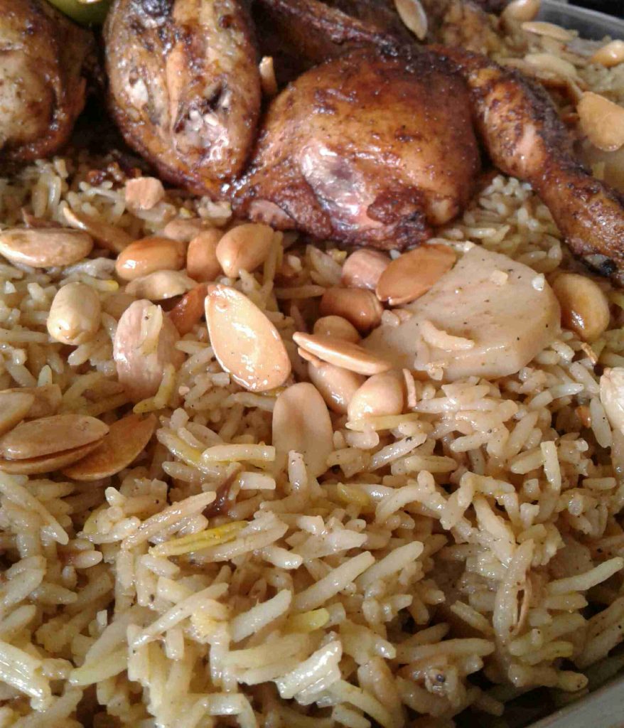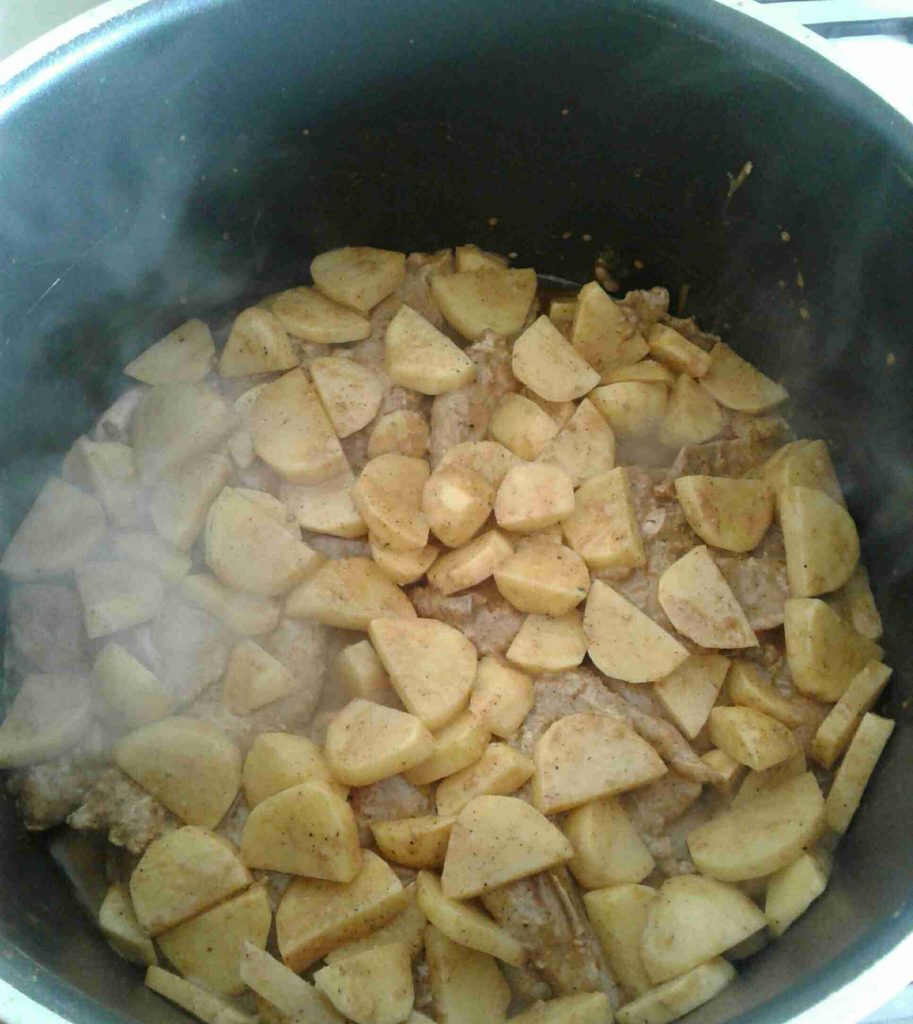 # سادساً : نصفي الأرز من الماء ونسقط نصف الكمية فوق الدجاج والبطاطا ، ثم طبقة من البصل المقلي ، ثم باقي الأرز ، ثم القليل من الكركم ، ونغطيها ، ونتركها على نار هادئة جداً مدة (٢٠) دقيقة.