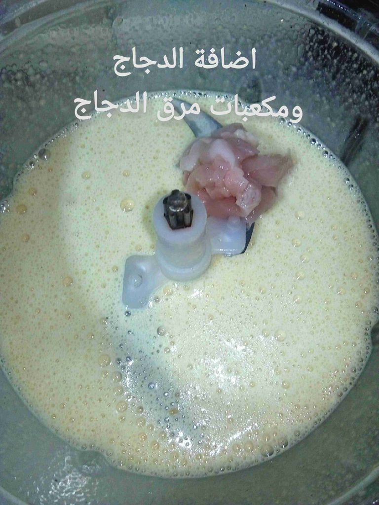 —بنضيف عليها الدجاج المقطع ومكعبات مرقة الدجاج وبنتابع الطحن لحتى يختفي الدجاج تماما.