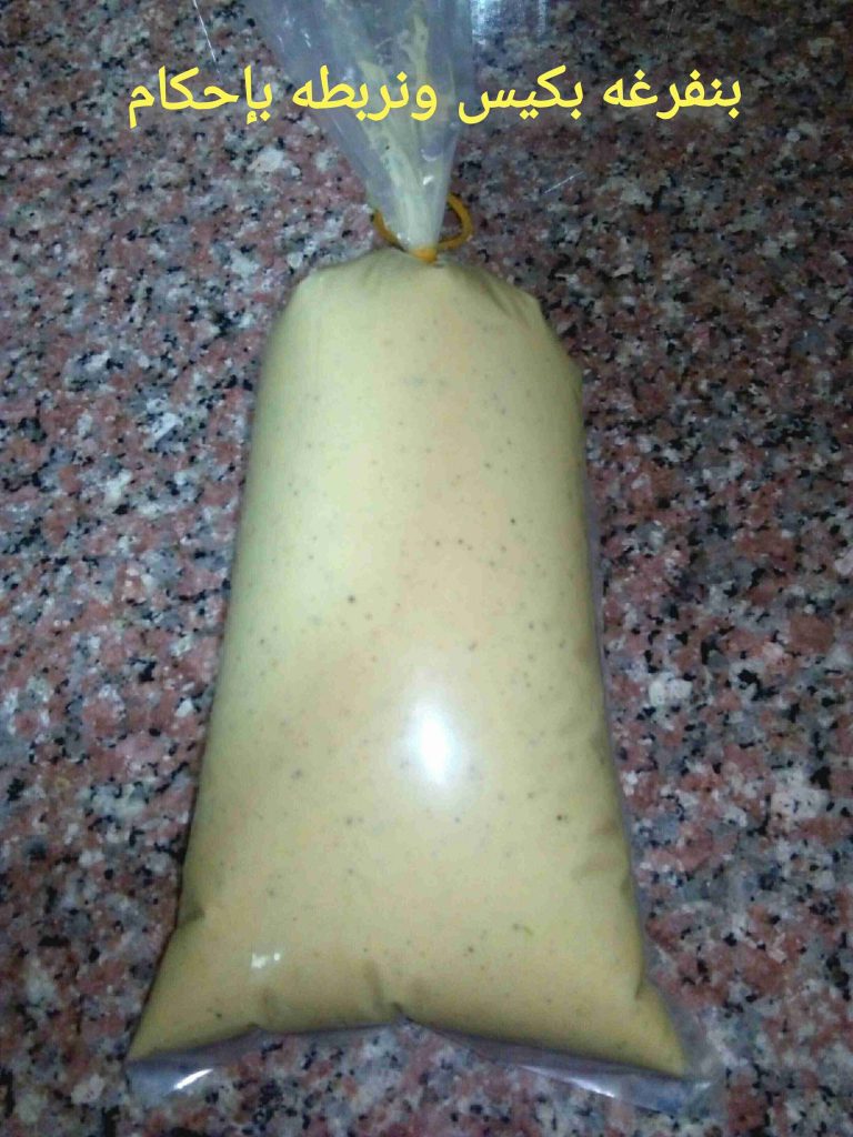 بنفرغ الخلطة بكيس بلاستيك او كيس حراري وبنربط بابه بمطاط وبنربط بقوة وبإحكام.