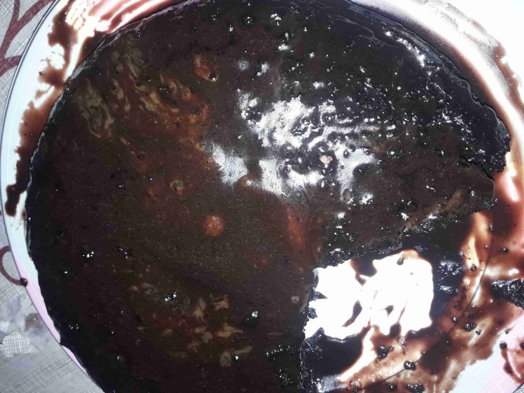 اول اشي زيت والحليب وسكر والكاكاو بخفقهن منيح وبقيم منهن كاسه بحطها على جنب بعدين بحط البيض والفانيلا بخفق منيح بنزل طحين والباكن بودر بخفق لما يختفي طحين بنزل بطنجرة تيفال مدهونه زيت وطحين وعلى نار هاديه جداا بتوخد وقت ٣٥ دقيقه بس يا بلمايكروف بتوخد ٨ دقايق بس تطلع بشربها بكاسة شكلاته الي قمتها من الخليط اول ما بلشت صحه وهنا زاكي وسهله وسريعه