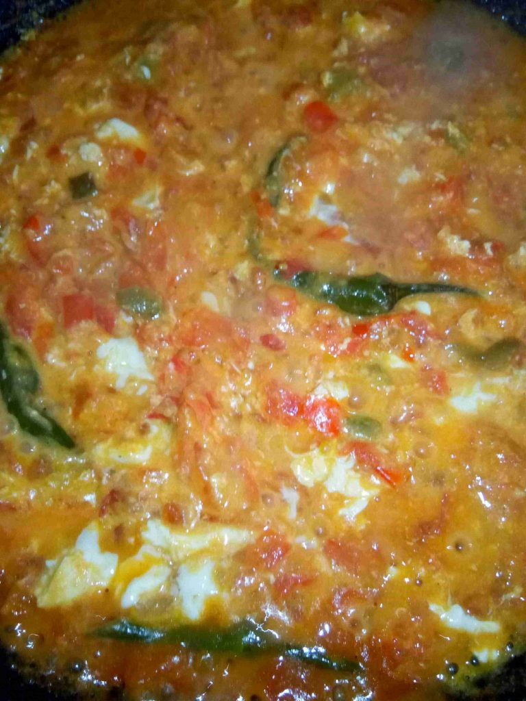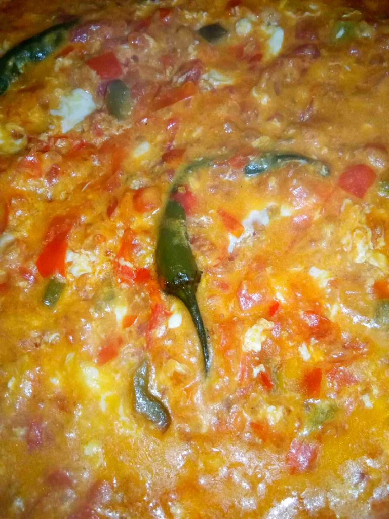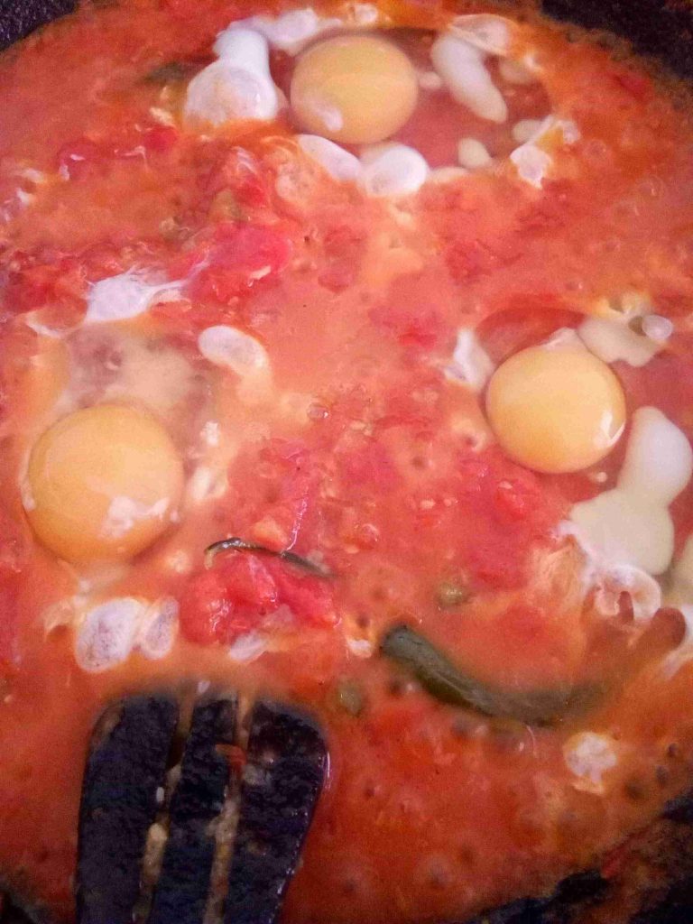 نفرم البندورة فرم ناعم ونضيفها عالفليفلة لحد ما تستوي بنفقص البيض عليها وبنحركه معها وبنحط ملح وفلفل