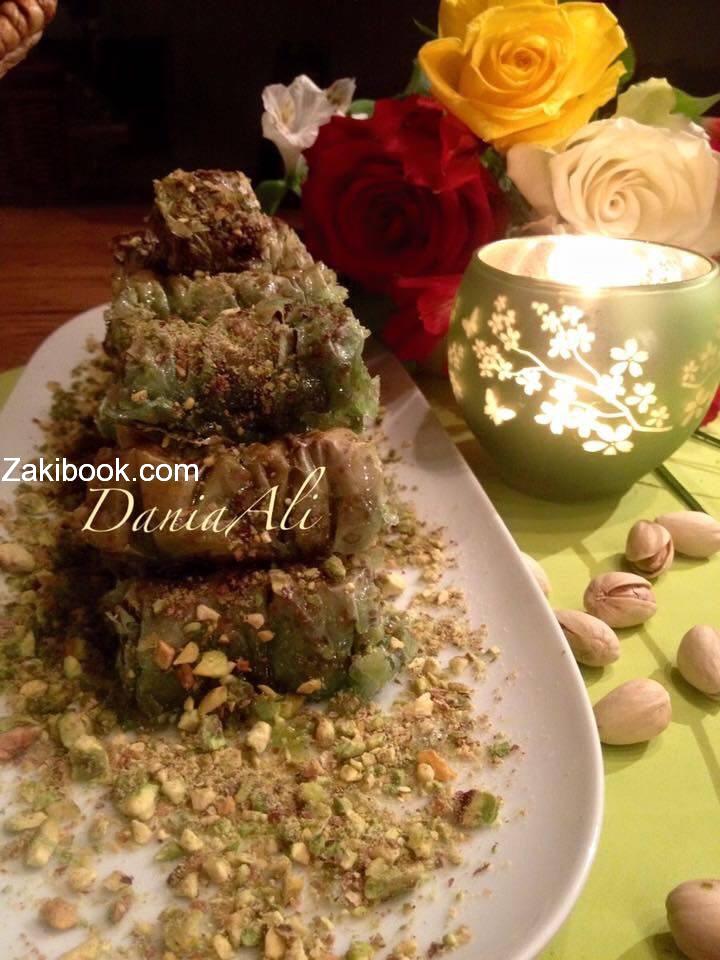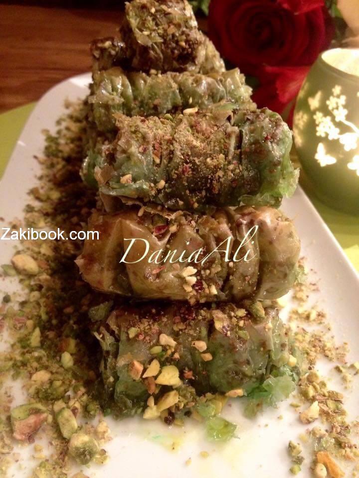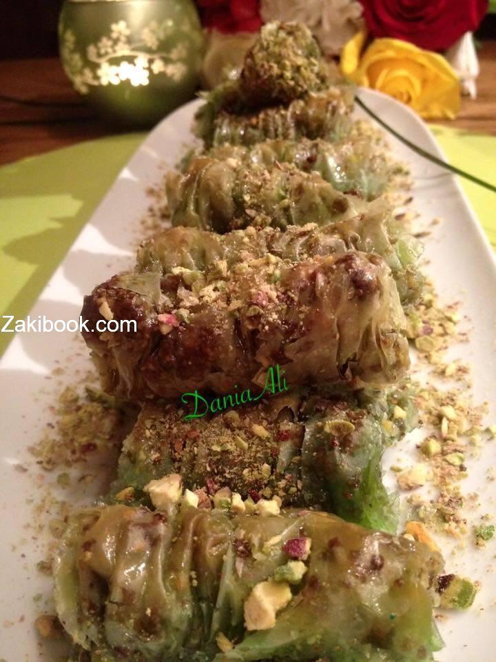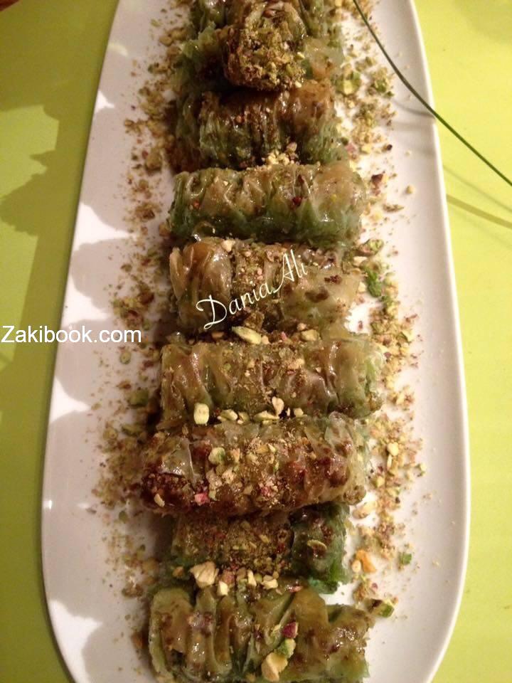 تقطع بسكين حاد ويصب عليها القطر الدافئ (كوبين سكر+ كوب ماء+ ملعقة صغيرة حامض الليمون وملعقة صغيرة طبعة الطعام الخضراء ) تصفى بواسطة مصفي من القطر والدهن الزائد وتزين بالمكسرات
