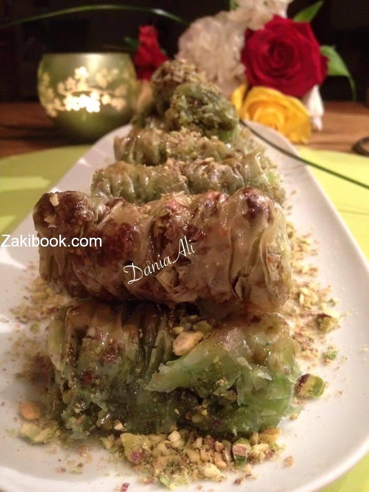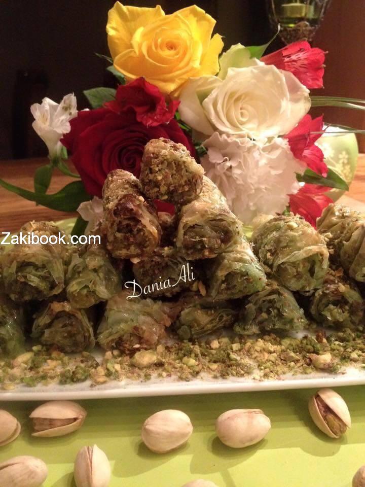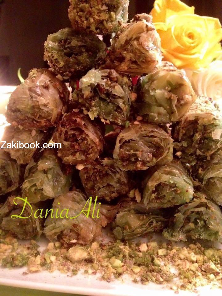 نسخن خليط الدهن المذكور حتى يذوب ويتجانس ونترك يفتر قليلاً ندهن ورق البقلاوة بضربات خفيفة بالفرشاة بخليط الدهن المذكور من الجانبين ونضع فوقها ورقة ثانية وندهنها ايضاً ونضع خشبة أسطوانية رفيعة على مسافة ٣ أصابع من طرف الورقة ونطوي ونترك مسافة ٣ أصابع بعناية دون رشها بالفستق ونرش القليل من الفستق على باقي الورقة ونلفها بحذر ونحاول الضغط على طرفي البرمة ليتكون لنا شكل متعرج ونسحب برفق ونضعها بصينية مدهونة بنفس الخليط ونكرر العملية
