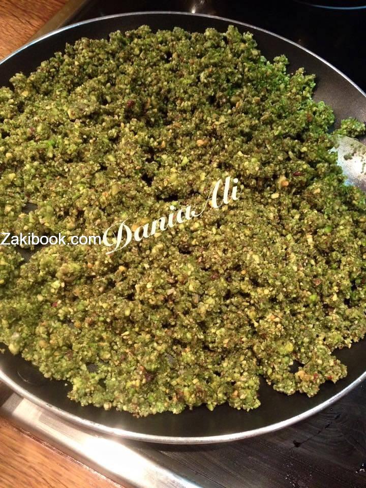 فستق حلبي مطحون او اي مكسرات حسب الرغبة يخلط مع ماء الزهر + هيل + ويرطب بالقليل من القطر (الشيرة) والجلوكوز ان توفر ويضاف اليه ملعقة صغيرة صبغة طعام خضراء