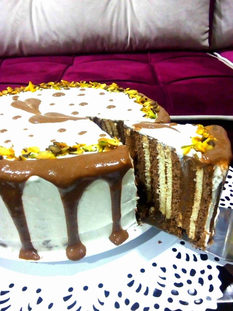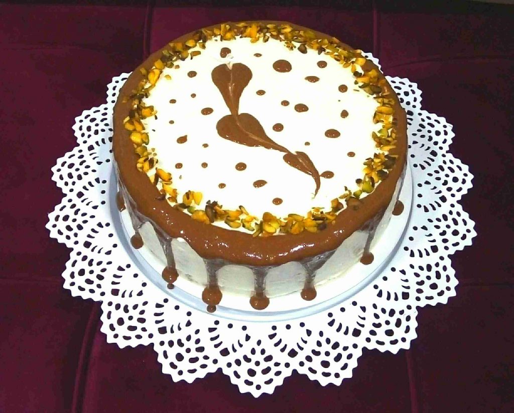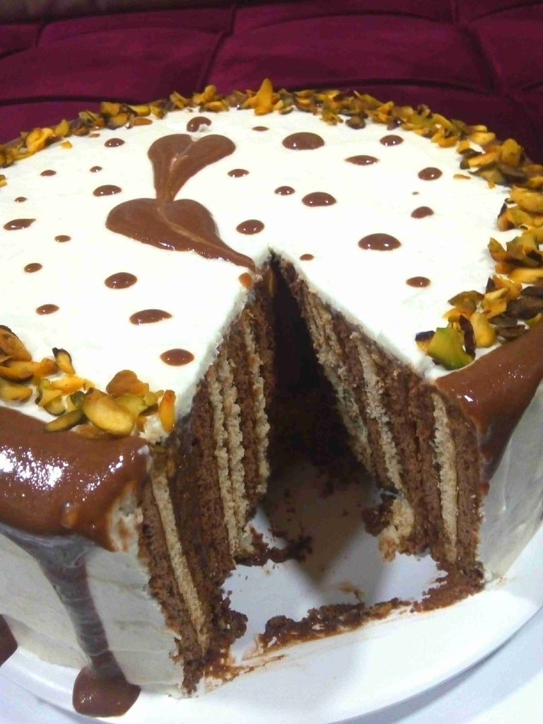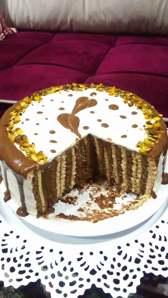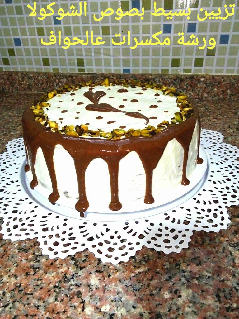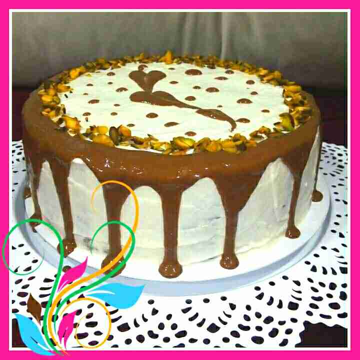 —بنغلفها بالكريمة وبنزينها من الاطراف بشوية صوص من الزائد( طبعا هوه ثاني يوم بكون جامد بتضربيه بالخفاقة بصير سائل وكثيف) ورشة فستق حلبي بكل بساطة.