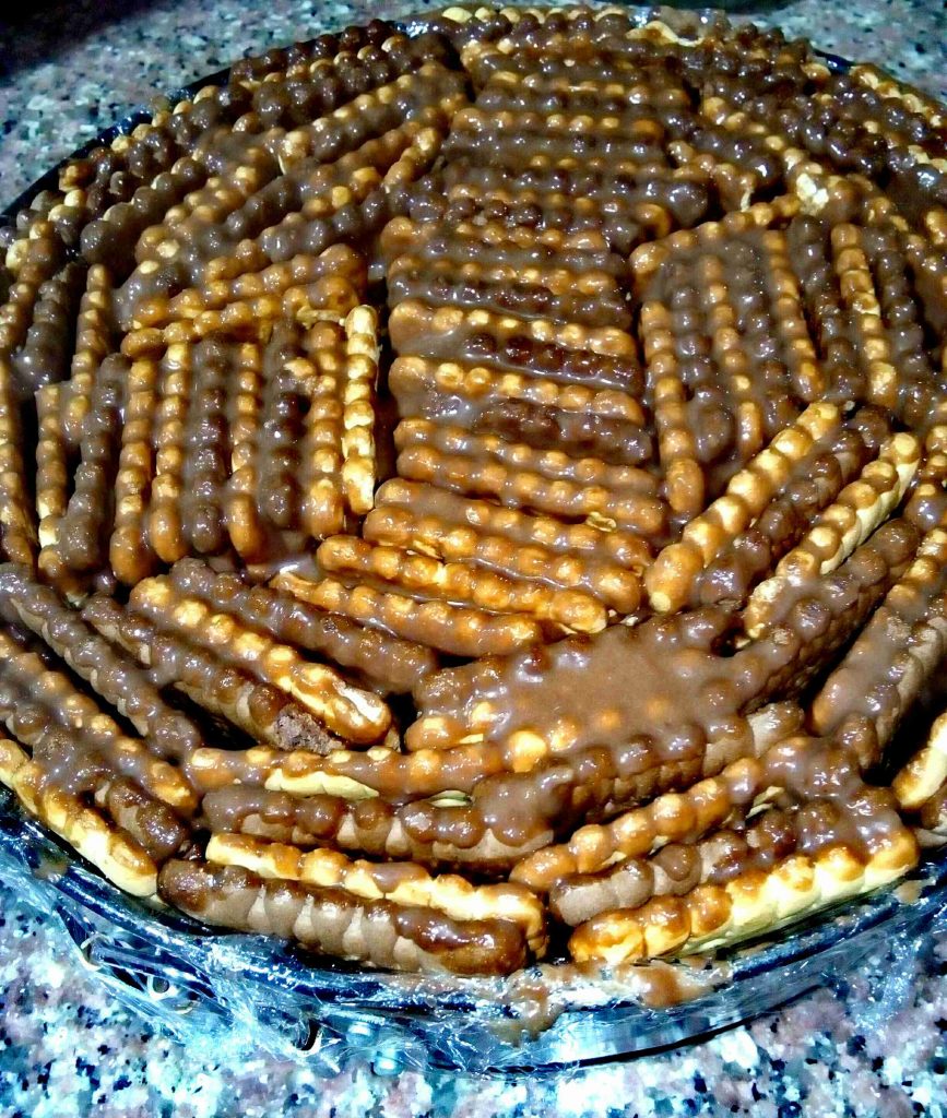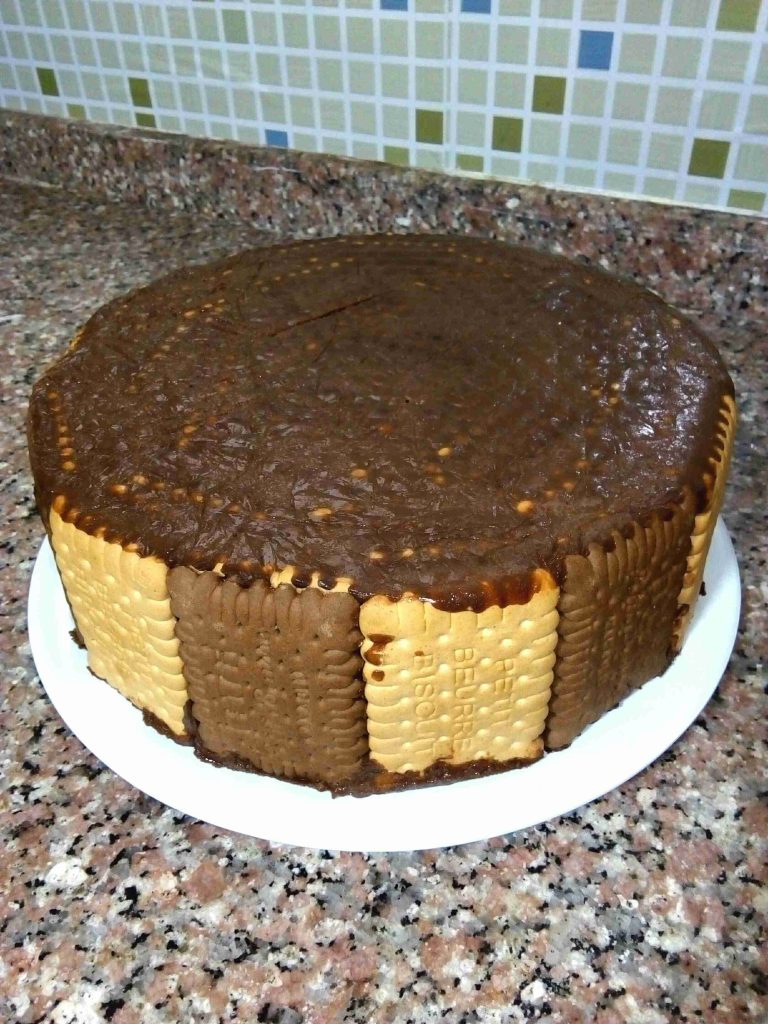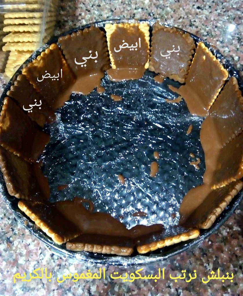 وبنبلش نصف البسكويت ( ابيض وبني) بنغمس البسكويته من الداخل فقط بالصوص وبنوقفها على حواف الصينية بس بالتناوب بسكويته بيضا بسكويته بني