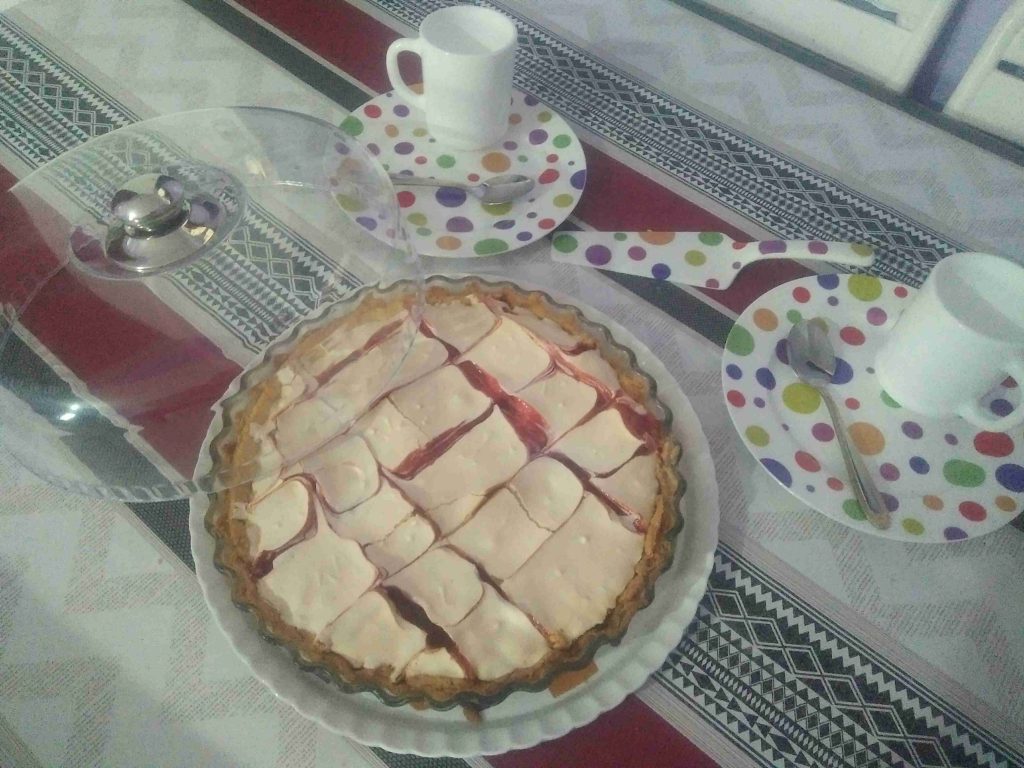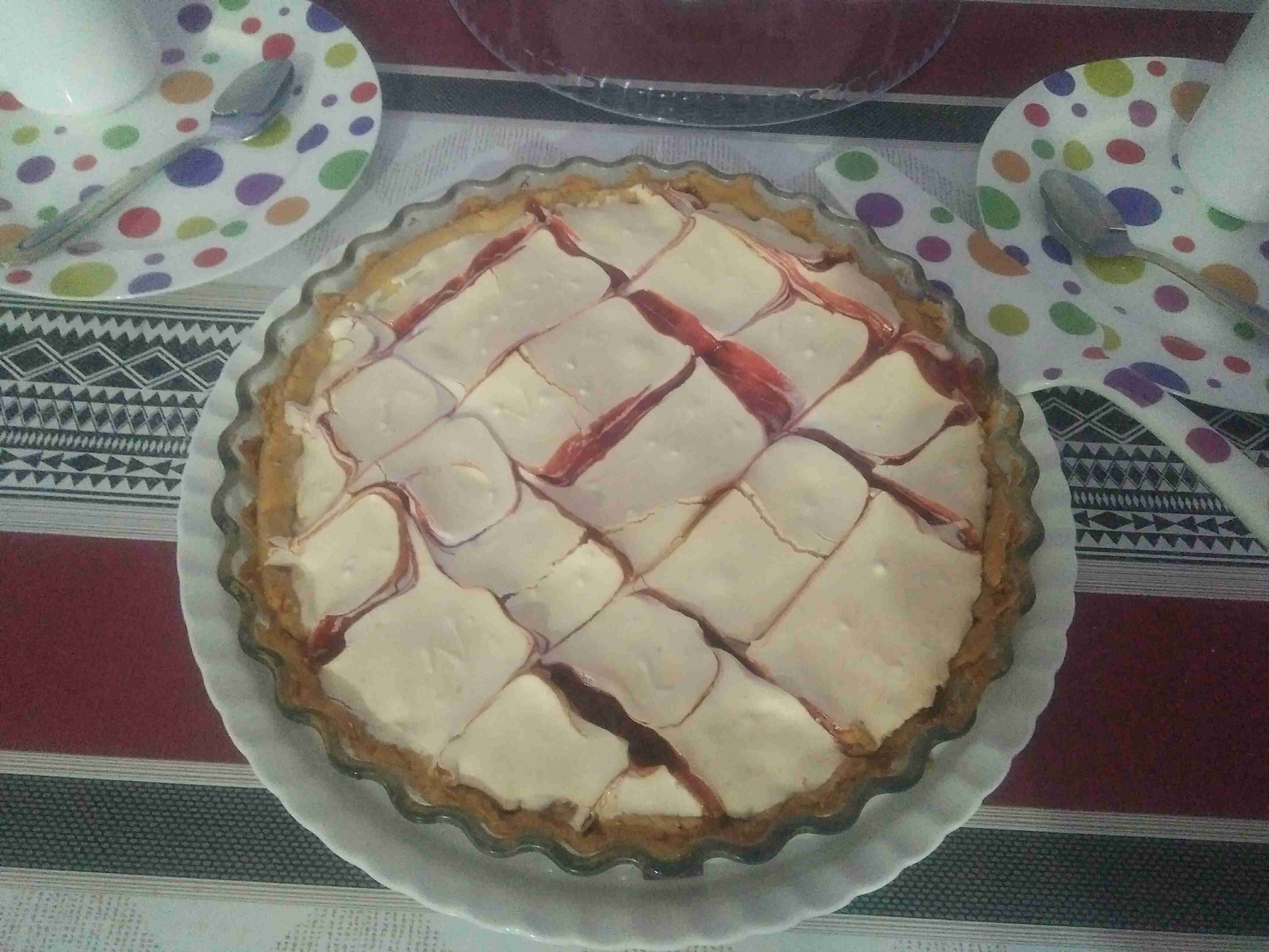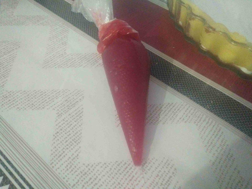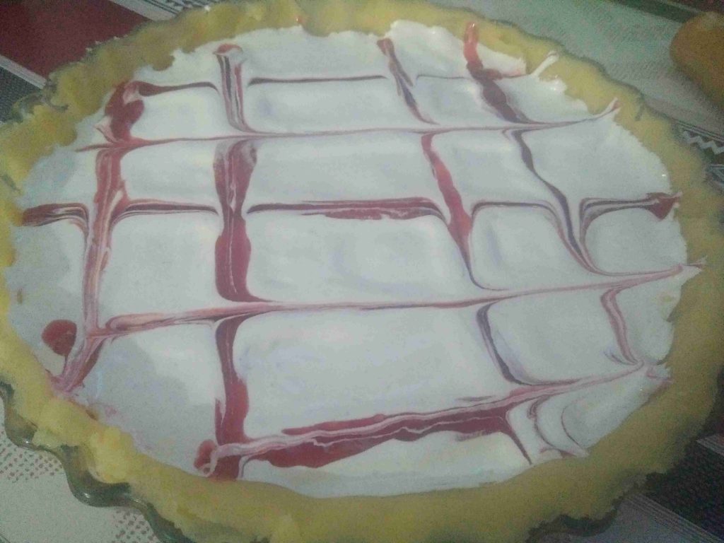 اما ماتبقى من المربى فنضعه في كيس حلواني و نرسم به خطوط أفقية وعمودية على المارينغ