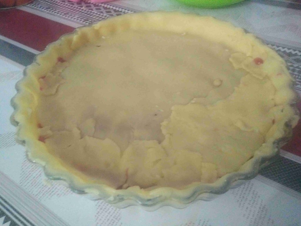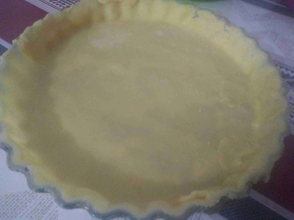 القسم الأول نفتحه بالشوبك و نضعه بقالب يدخل الفرن سبق و أن دهناه بالزبدة