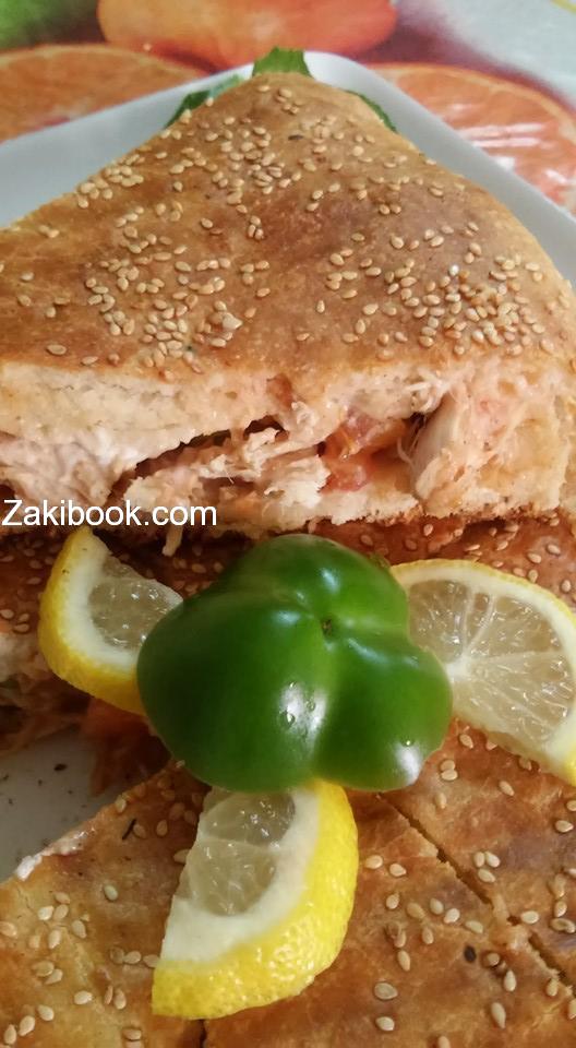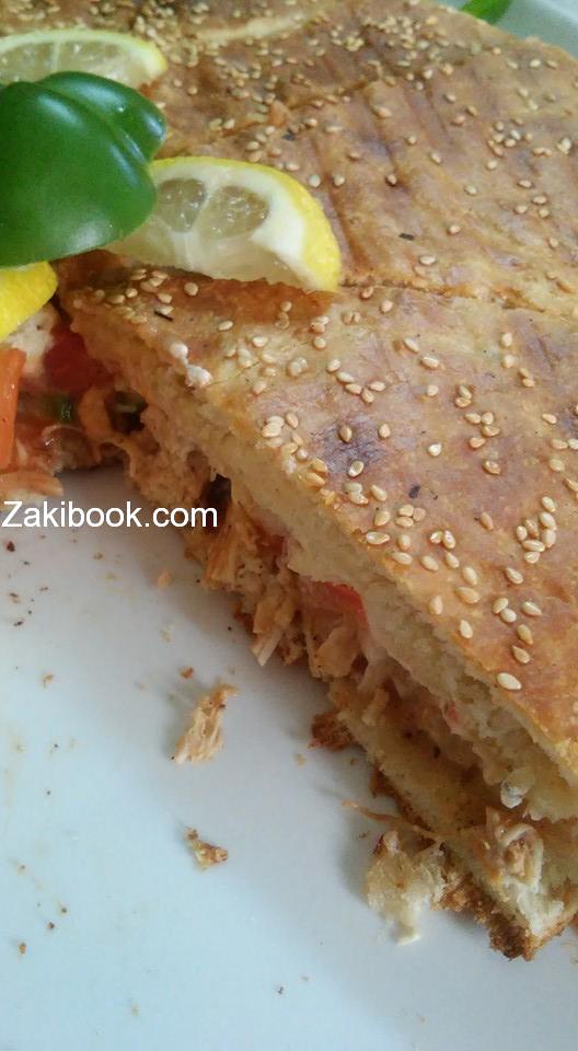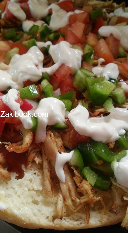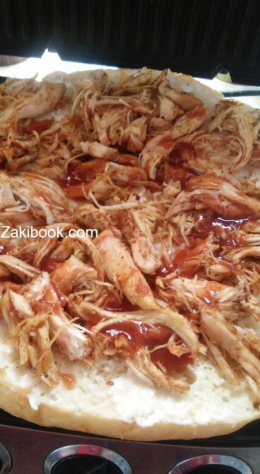 نقطع الرغيف من النصف وندهنه مايونيز القسم الاول بنحط عليه الدجاج المقلى وكاتشب وسلطه على زوئك شو بتحبي خضره وصلصه طحينه مع لبن رايب ونغطي الرغيف ونكبسه على التوست