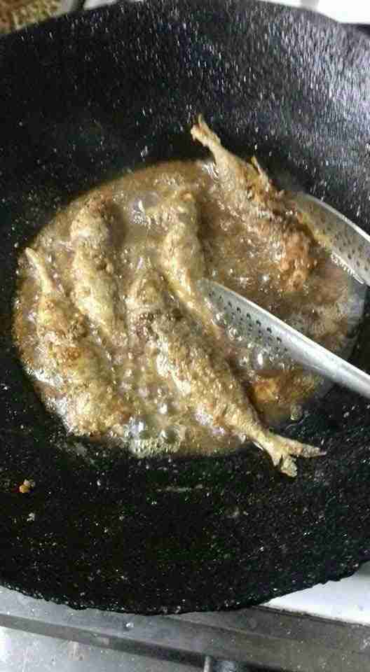 نضع السمك في الخليط ثم يقلى بالزيت المحمى سابقا ويقلب حتى يحمر