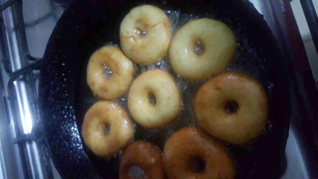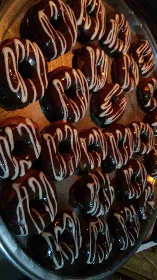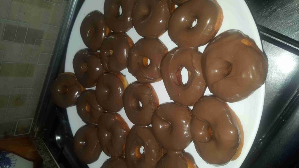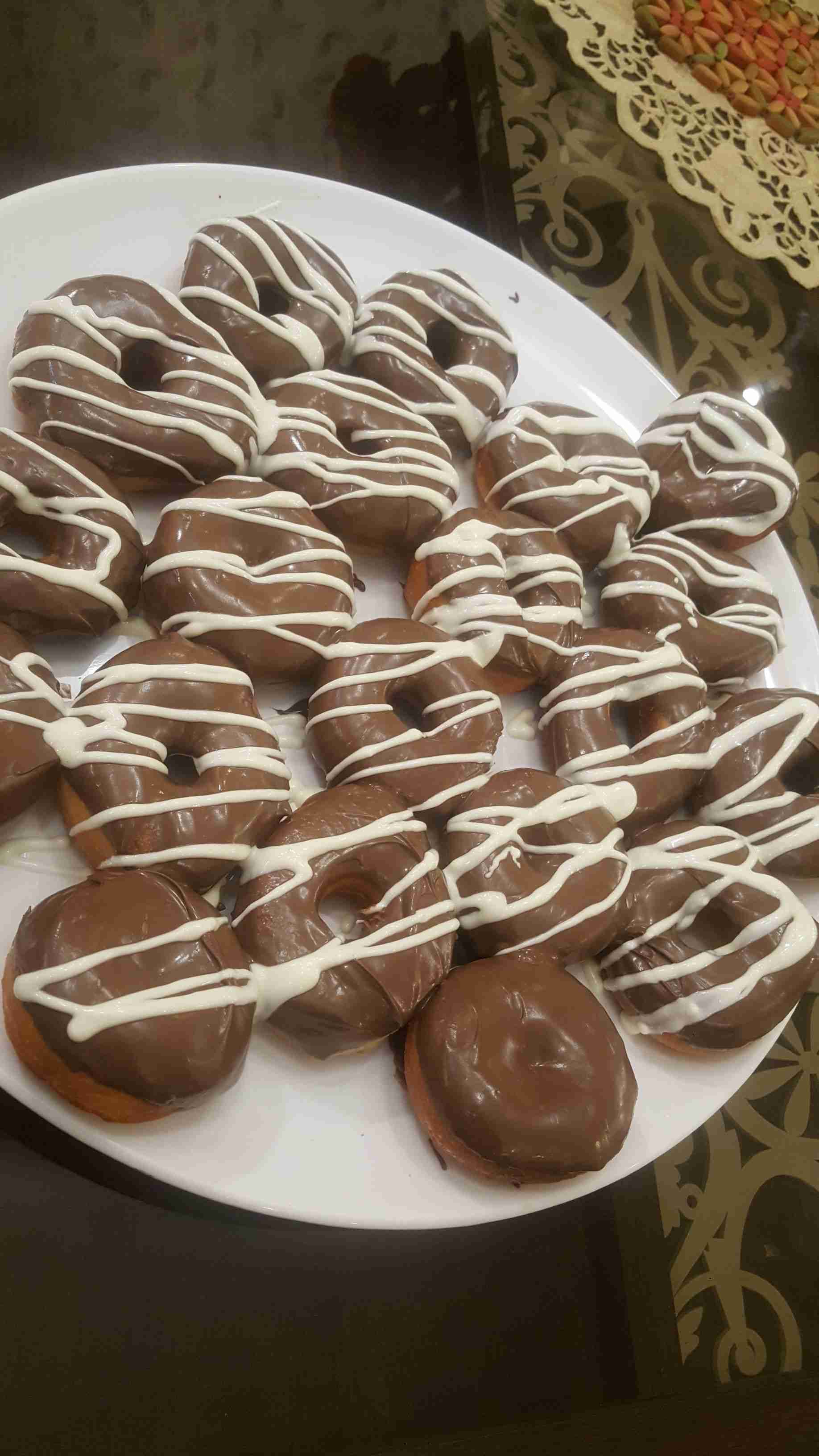 نضع الحليب والسكر والخميره ونخلطهم جيدا ونتركهم١٠ دقايق بعدين بنضيف الملح والزبده الدايبه والفانيلا والبيضه وبنحركهم منيح واخر شي بنضيف الطحين والباكنج باودر وبنعجنهم منيح وبنتركها تتخمر بمكان دافي بعدين بنعجنها عل الخفيف وبنرجع نخمرها كمان مره بعدين بنفردها على الطاوله وبنخليها بسماكه ٢ سم وبنقطعها دوائر وبنتركها ترتاح ربع ساعه بعد التقطيع وبنقليها بزيت حامي وغزير وبعدين بنغطسها بالشوكلاته وبنزينها بشوكلاته بيضه على شكل خطوط