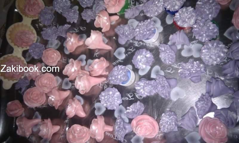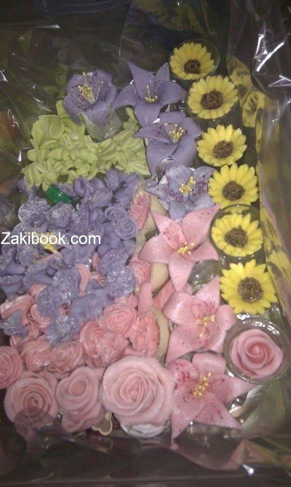 5 بكون مجهزة من قبل ورد و أوراق بواسطة غراء غذائي (ملعقتين ماء +ملعقتين غلكوز ) بركب الورد على الكيكة.