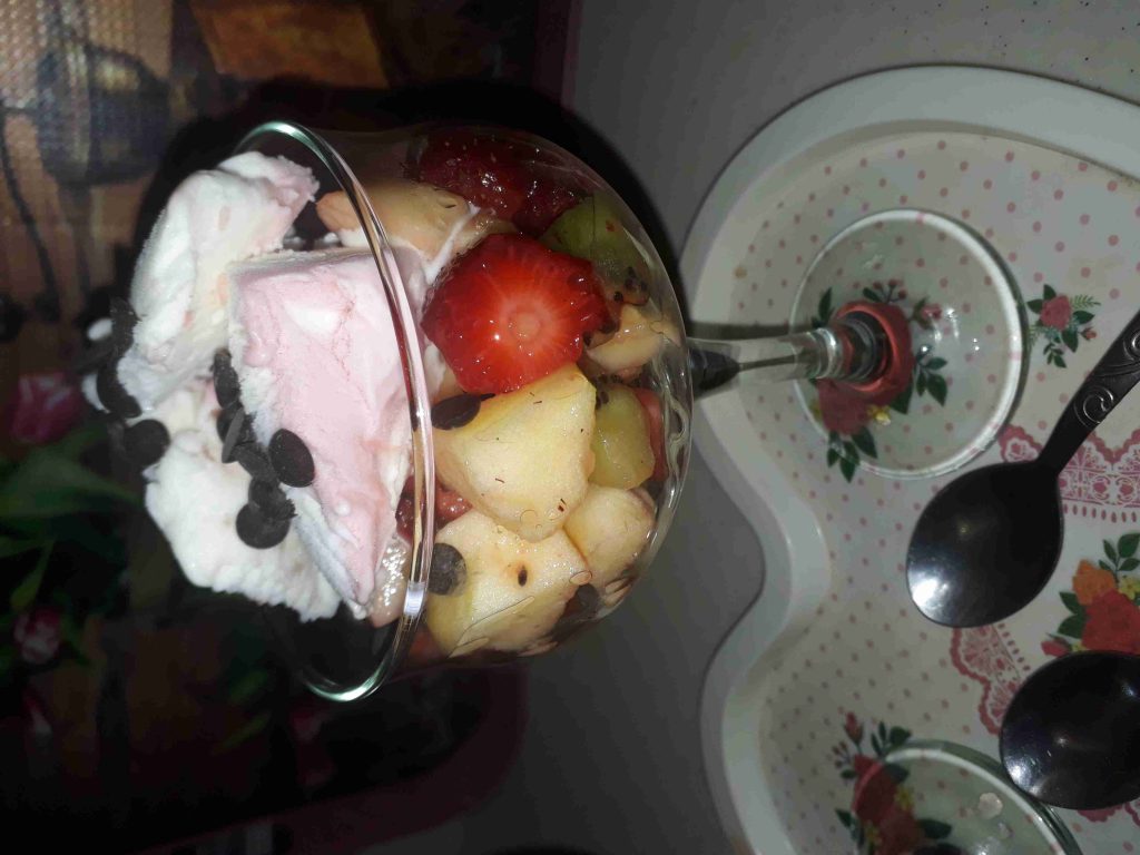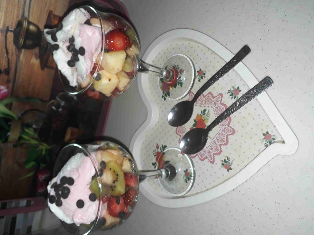 قطعت الفواكه حبات وسط وخلطتن وحطيتن بصحن التقديم ضفت عالوجه بوظة وزينتا بالشوكلا