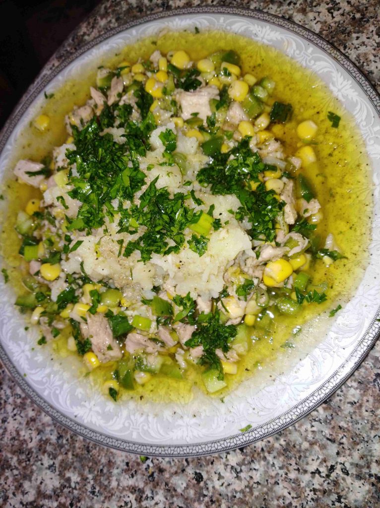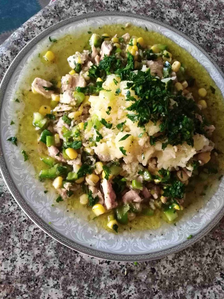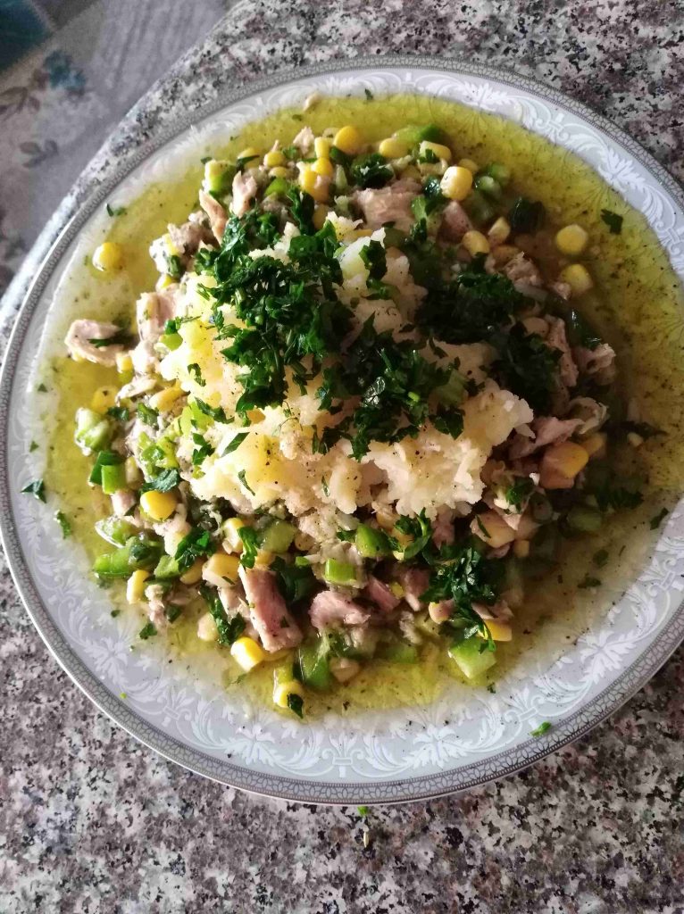 بنحط التونة مع الفليفلة والذرة والبقدونس والبصل وبصحن بعمل الصوص (التوم مع زيت زيتون وبرش الليمون والليمون والملح وفلفل اسود) بحط نص الصوص عالتونة والفليفلة والذرة والبصل والبقدونس وبخلطهم شوي شوي بعدين بضيف البطاطا المسلوقة وبضيف عليها باقي الصوص وبنزين برشة بقدونس