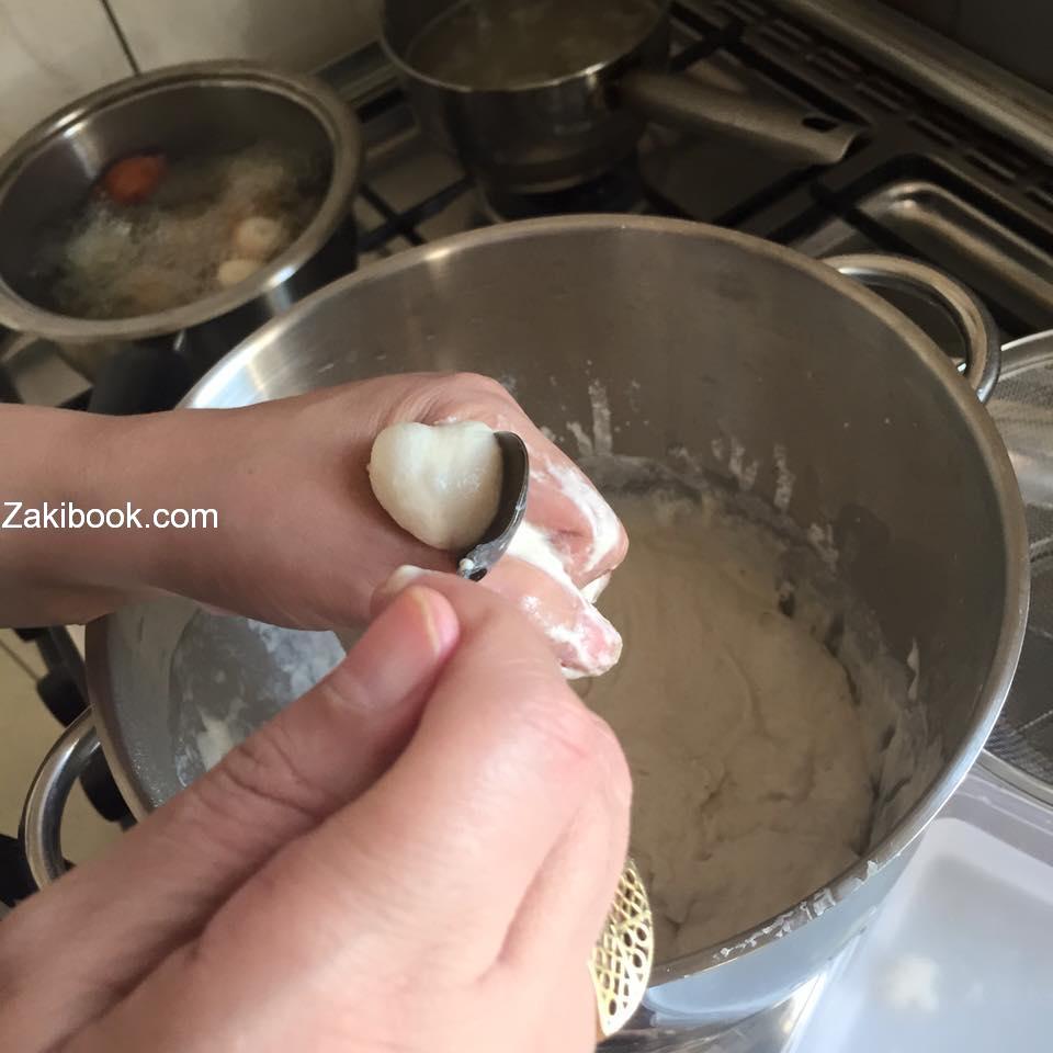 – وانتي بتقلي حطي كوب ماء او زيت افضل نضع فيه الملعقه ونقطع من العجين الصوره بتوضح الطريقة.