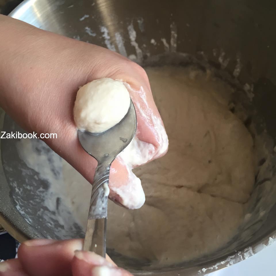 – تخفق جميع المقادير بالعجانه او باليد لنحصل على عجينه مطاطه نستطيع وضعها باليد ونقطع منها يعني مطاطه مائله للسيوله وتغطى وتوضع جانبا مدة نصف ساعه حتي تختمر