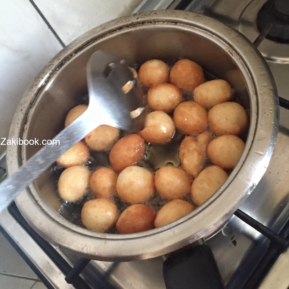 – نعجنها قليلا باليد ثم نضع في طنجره القلي زيت غزير ليحمى ثم نهدي الناريعني ممكن اول حبات يتحمروا بسرعه مش مشكله انا المهم عندي الزيت حرارته مش مرتفعه والعوامه تتحمر على مهلها يعني بتتاخر لما يصفر لونها بطلعا وبحطها في مصفي ونكمل بقية العجينه.
