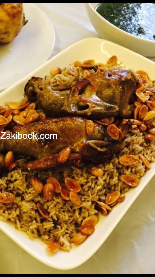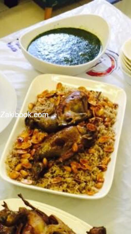 – باق الرز تبع الحشي بكمل انضاجه وعند الغرف بنزينه باللوز والصنوبر ويقدم بجانب الملوخيه.