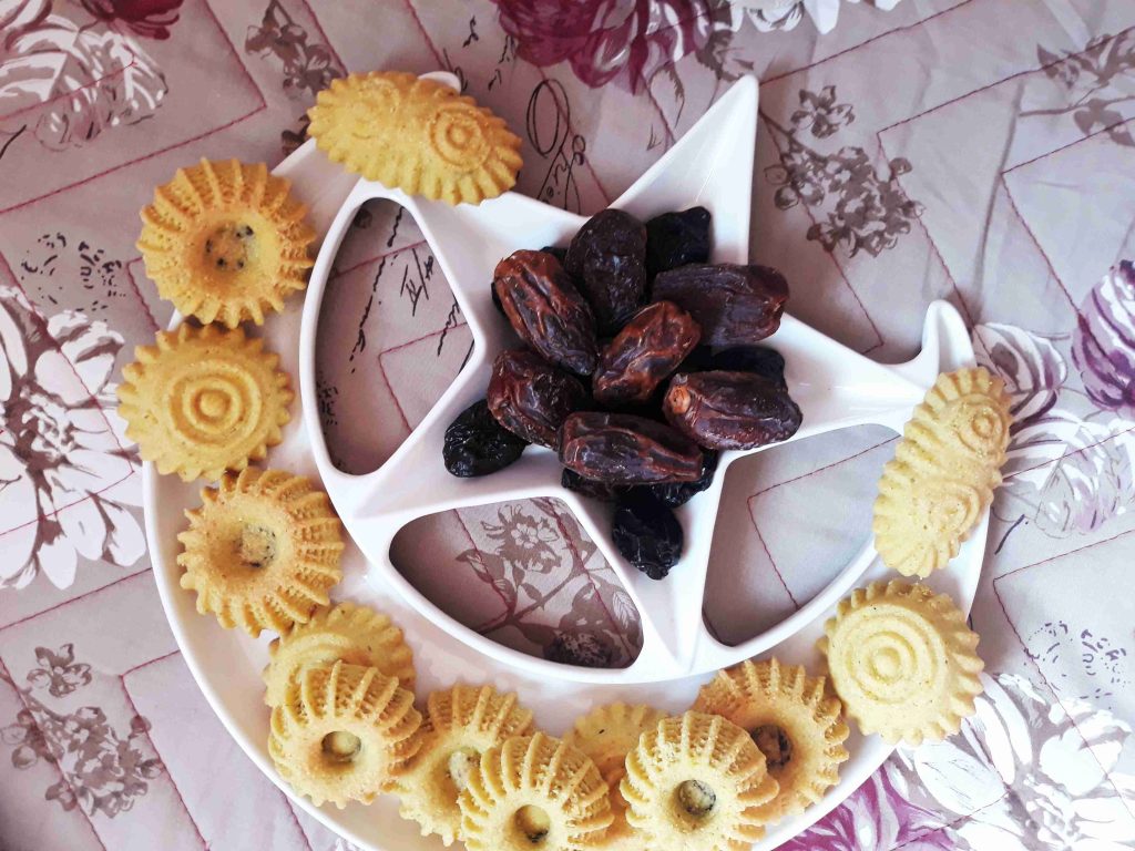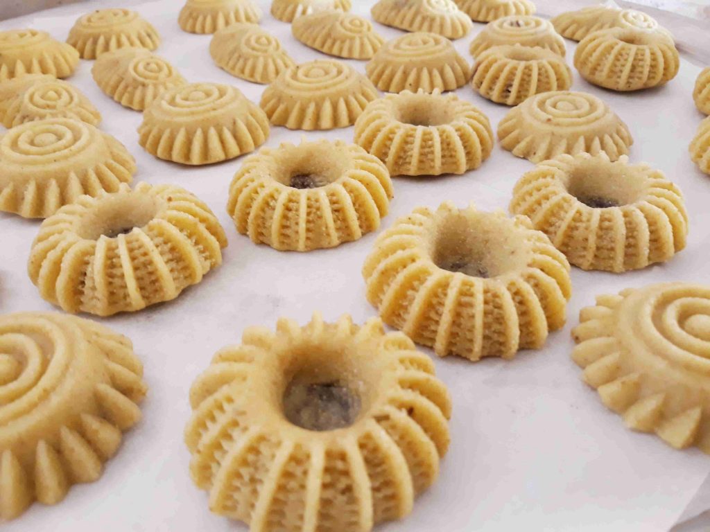 وبس ترتاح العجينة نصف ساعة وبنقطعها دوائر صغيرة نحشها بدوائر التمر ونرصها بالقالب او ننقشها بملقط المعمول ونصفها بالصينية وبنريحها ربع ساعه قبل الخبز ونضعها بالفرن تحمير من الاسفل ثم من الاعلى على نار هاديه تقريبا 180 درجه لمده ربع ساعه