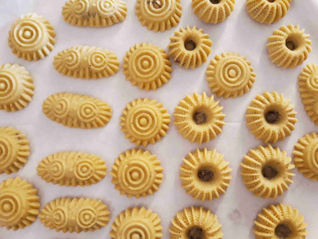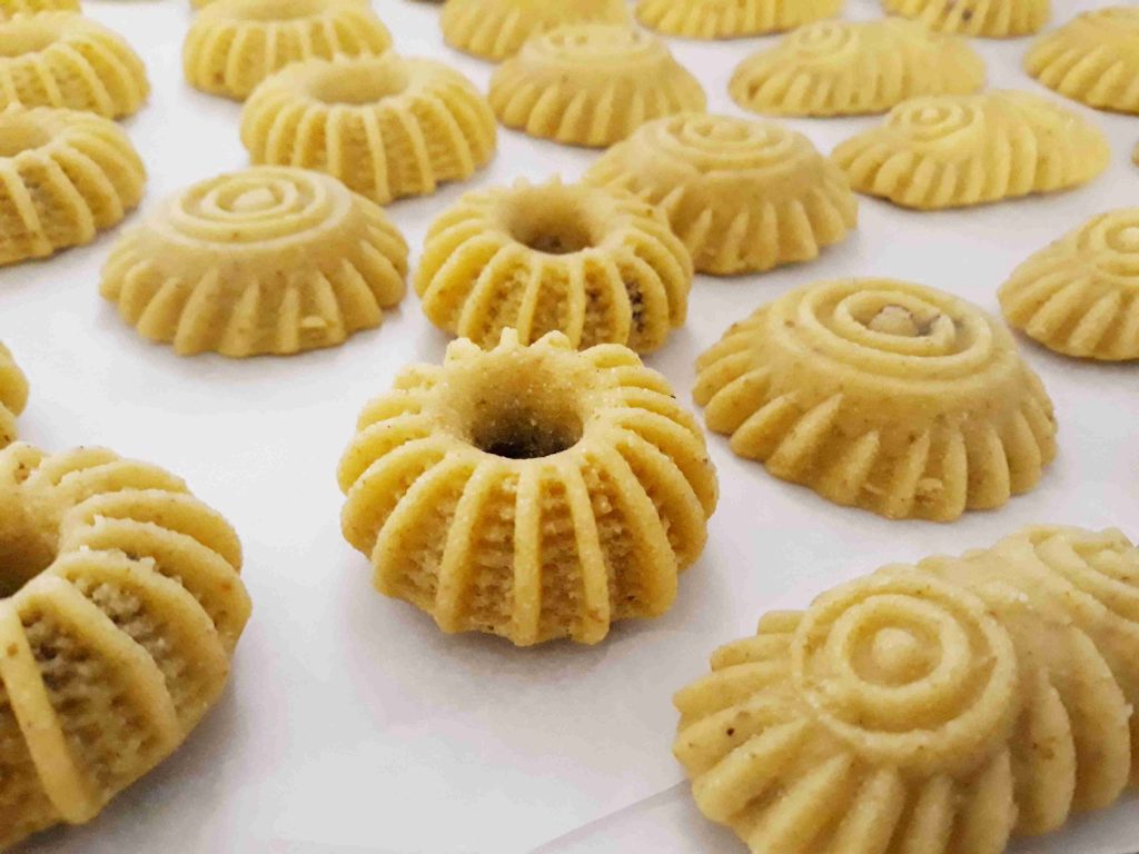 صبايا في ملاحضه مهمه نسيت اذكرها وخصوصي للي بشكلو المعمول بالقوالب بنعمل خرم صغيره بمساعده نكاشه الاسنان بوسط حبات المعمول قبل الخبز مباشره وهالشي بساعد البخار يطلع من غير ميغير رسمه القالب وبتضل الرسمه محفوره حفر