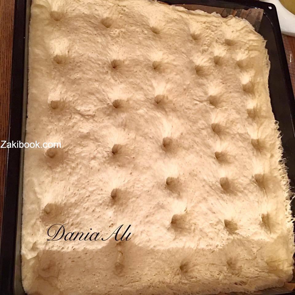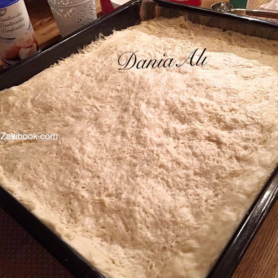– نحضر صينية بحجم 30×40 ندهنها او نستخدم ورق الزبدة نشغل الفرن على درجة حرارة 225 درجة بعد التخمير تفرد العجينة بالصينية بمساعدة القليل من الدقيق تغطى وتترك لتتخمر 30-35دقيقة.