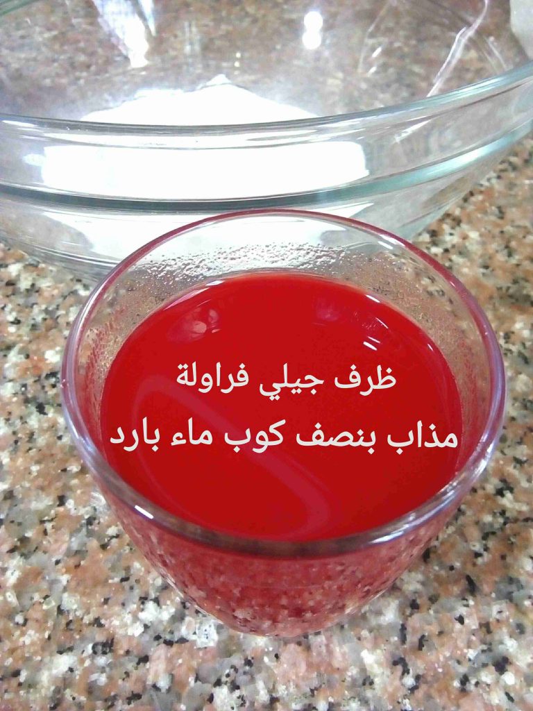 - ظرف جيلي فراولة مذاب بكوب ماء بارد مثلج