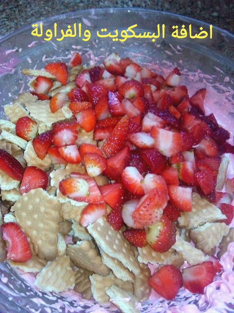 بنضيف قطع الفراولة للخليط والبسكويت بنكسره وبنضيفه