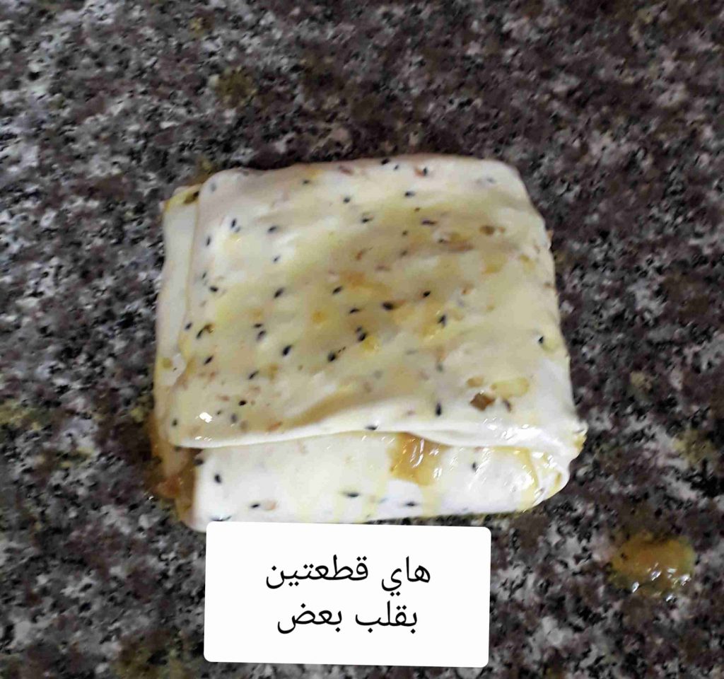 بجيب كرة عجين ثانية وبفردها وبدهنها بصل وزيت وقبل مااعملها مربع بحط بنصها مربع العجين اللي عملته بالاول وبعد هيك بعملها مربع نفس ماعملت بالقطعه الاولى مع دهن الاطراف بالزيت والبصل وبنحطة ع جنب