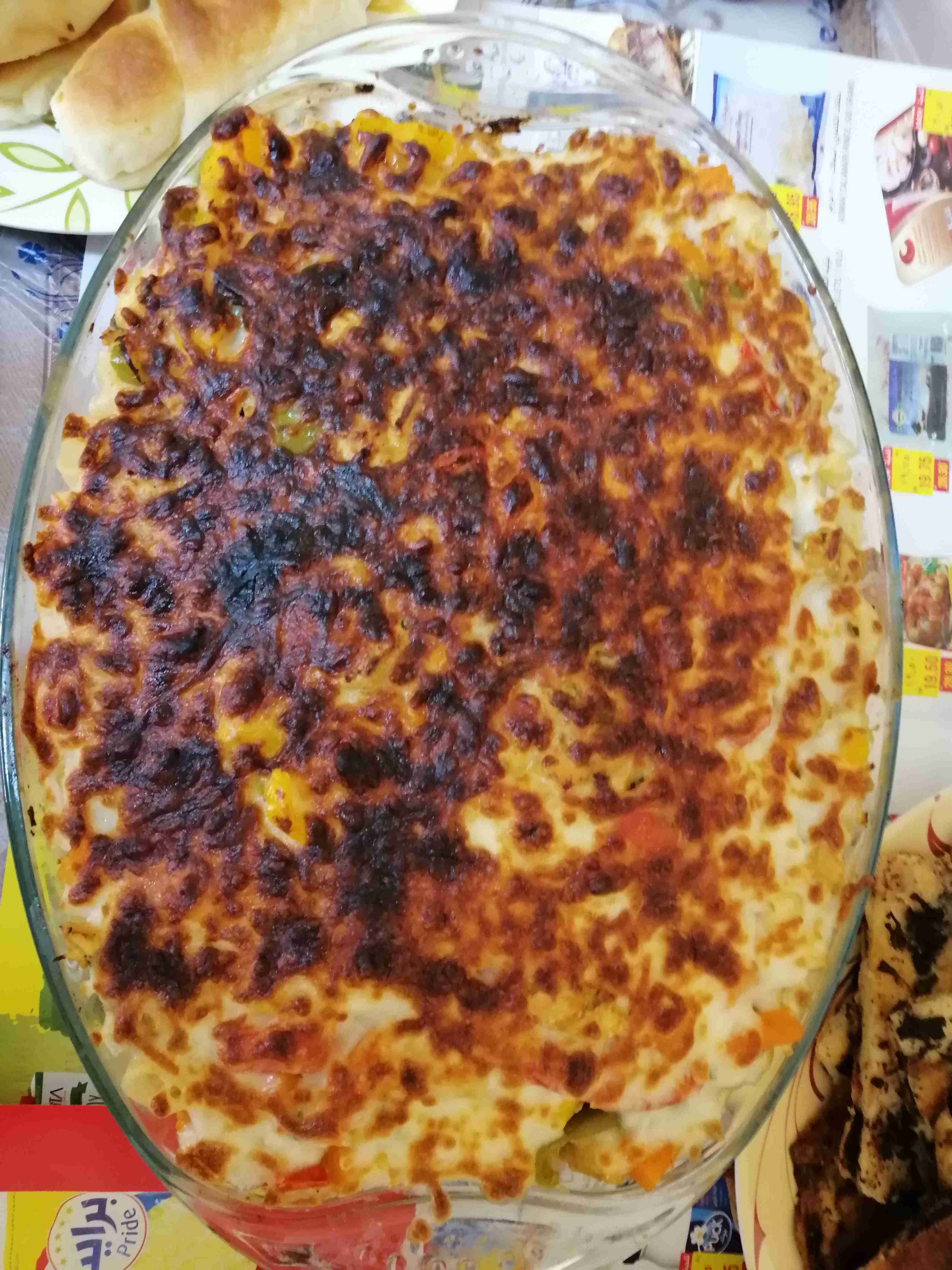 ثم نصفيها من الماء ونضيفها في صحن البايركس ونضع عليها المقدار المرغوب من الخلطه ونحرك المزيج قليلا للتجانس ونضع عليها جبنه الموزيلاريا وندخلها الى الفرن حتى تسيح الجبنه مع التحمير حسب الرغبه