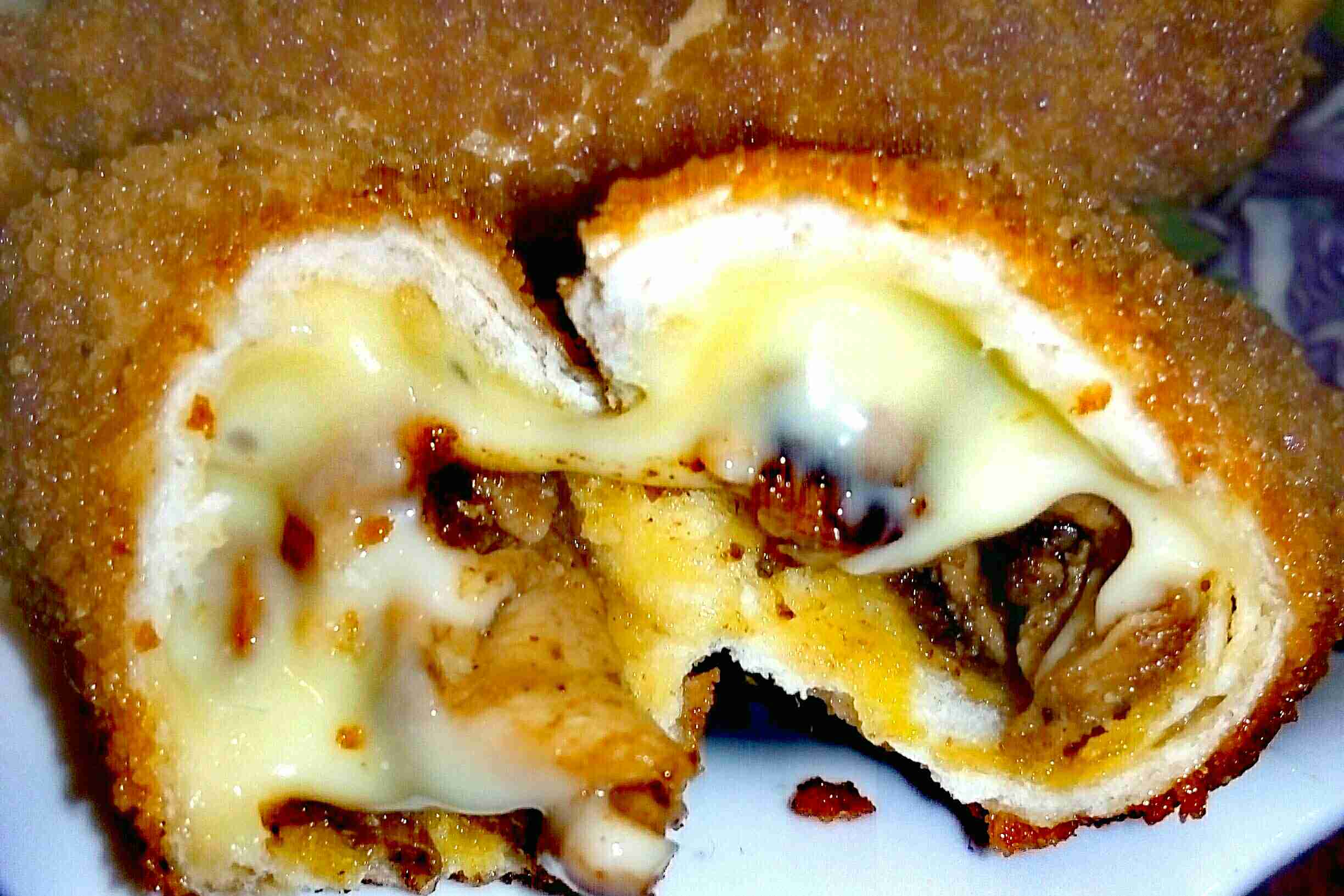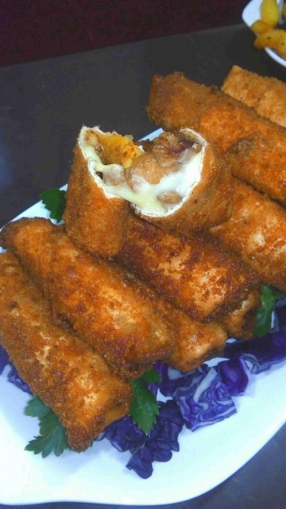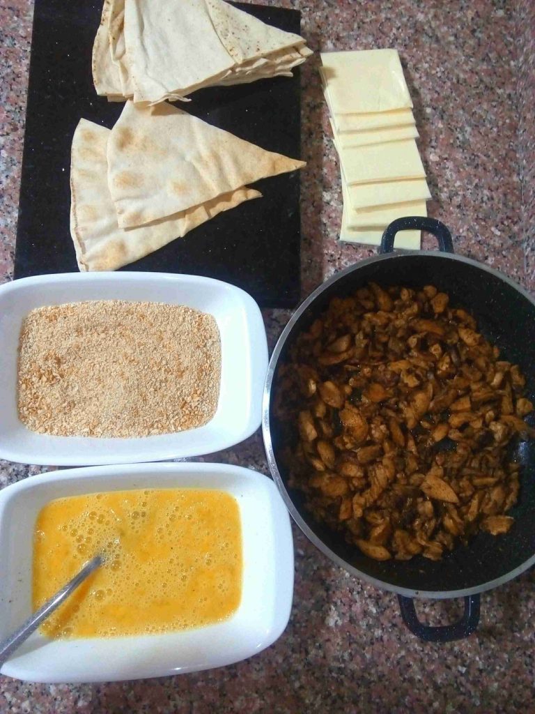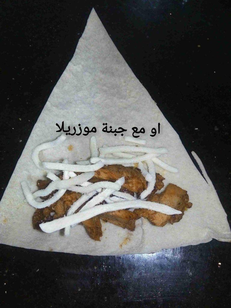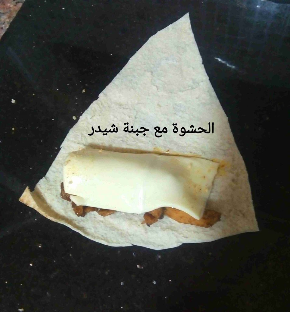 بنحتاج خبز عادي رقيق يكون وبنقطعه مثلثات وبنفتح الطبقتين لكل مثلث وبنحط بجهة المثلث العريضة من الحشوة وفوقها جبنة وبنلفيها من الجوانب بالاول بعدين بنرولها للاخر زي ورقة العنب يعني.