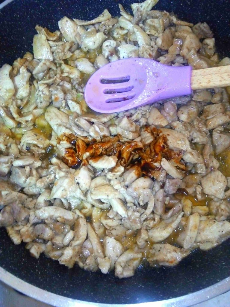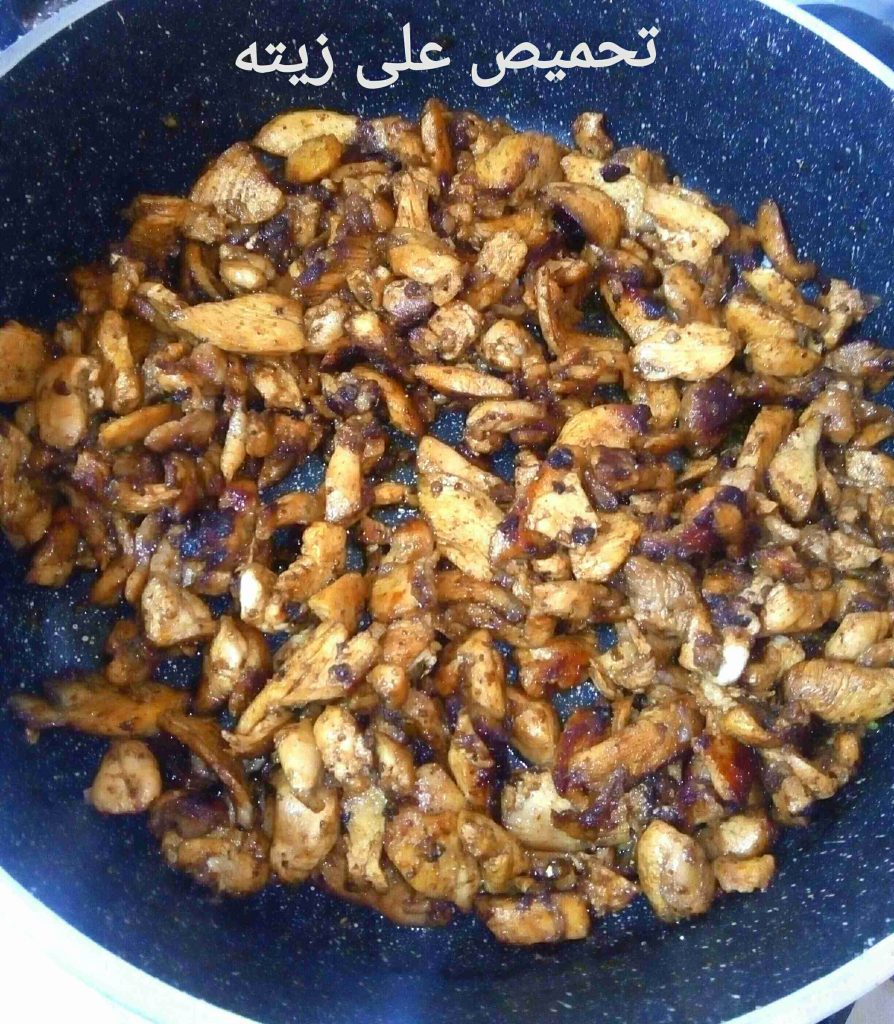 بنقطع دجاجة مخليه من العظم لشرائح صغيرة وبنقلبها عالغاز مع بصلة صغيرة وملح وفلفل ورشة كزبرة ناشفة ورشة هيل مطحون وبهارات دجاج وبنقلبها مزبوط وبعدين بنضيف نصف كوب دبس رمان وبنقلب لحتى يتنشف الدجاج ويتحمر بتكون الحشوة جاهزة.