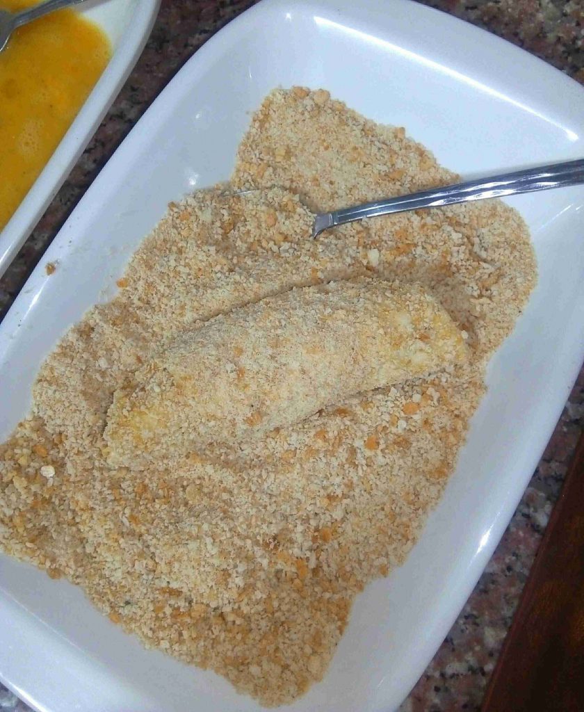 —هون بدك تضلي ماسكه الرول عشان مايفلت وبتغمسيه بالبيض وانتي ماسكيته لا تتركيه وبعد البيض عالبقسماط مع الضغط عالرول كويس هون خلص بكون لصق بتحطيه بصينية على جنب وبتكملي كل الكمية بنفس الطريقة.