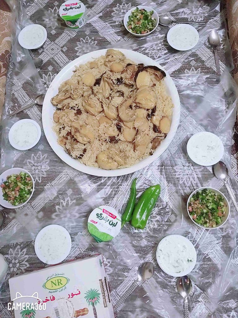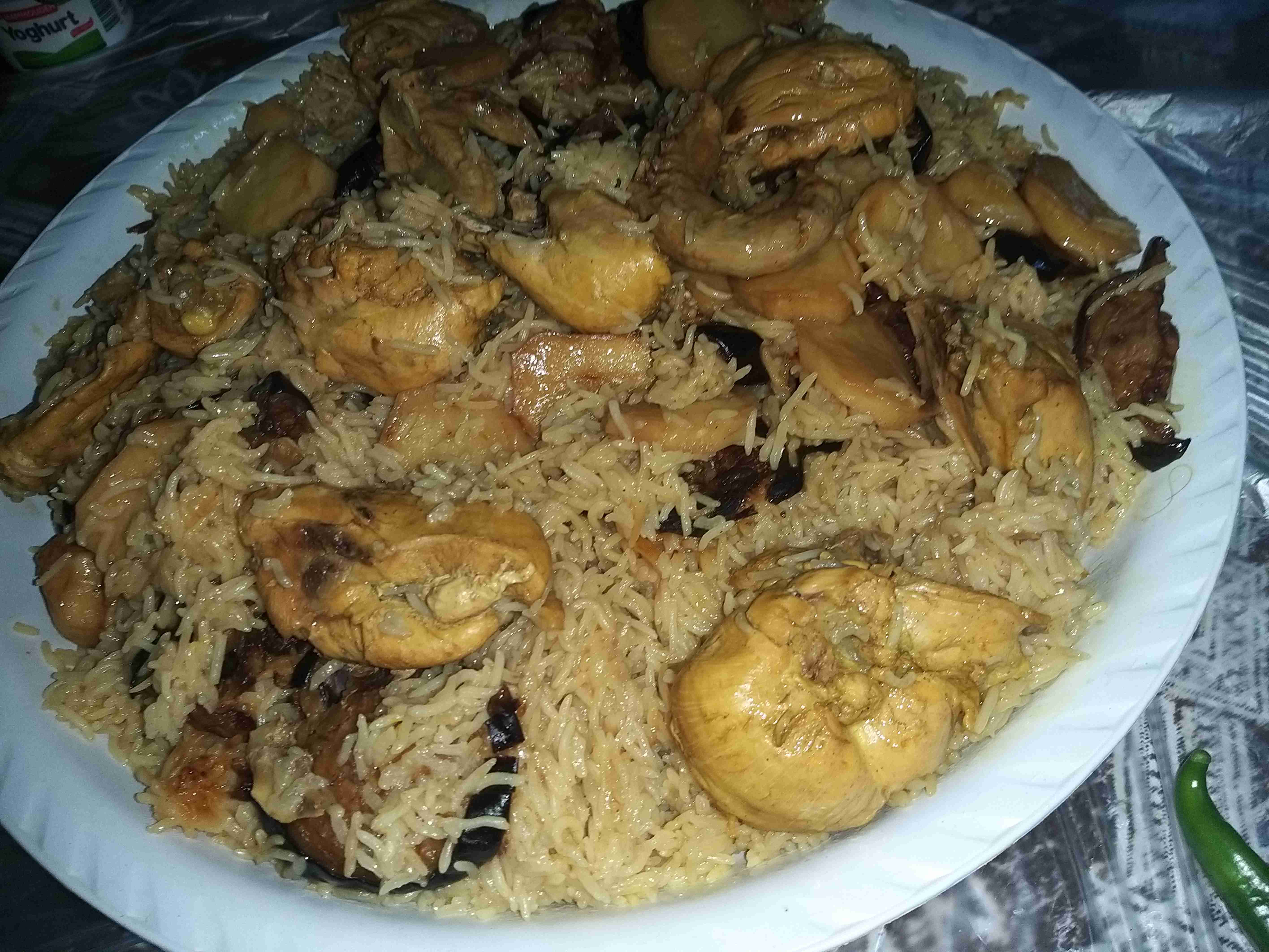 بطبق الجاج والباذنجان المقلي اهم شي يكون مقلي لدرجه التحمير لانه بعطي للرز لون بني