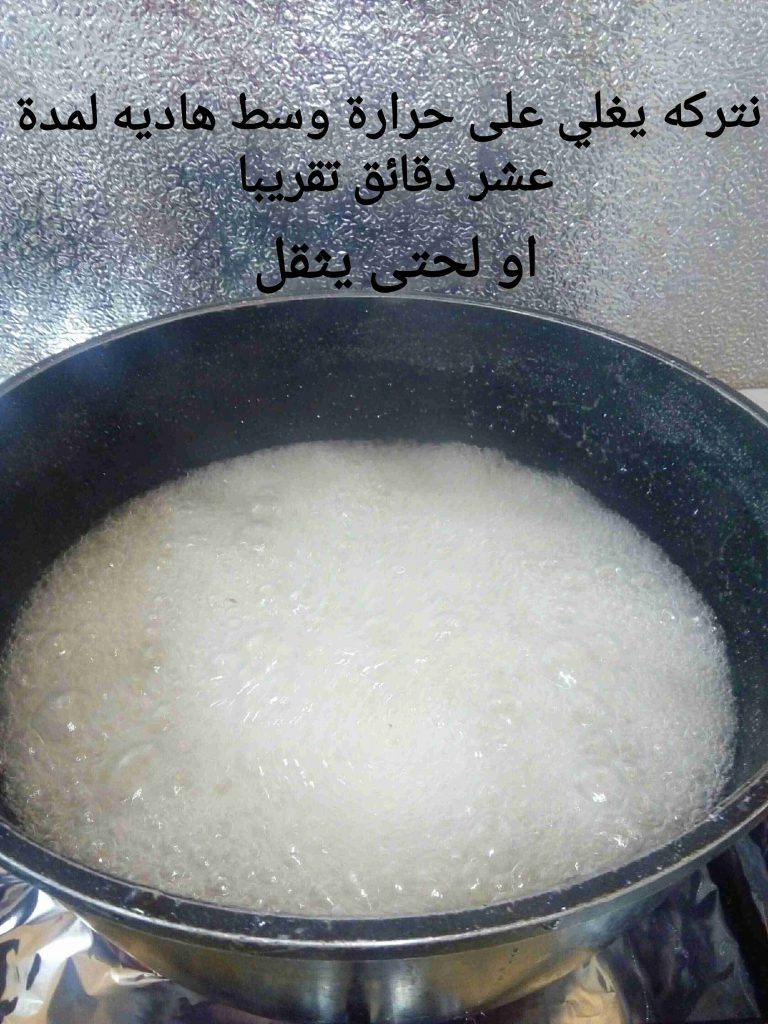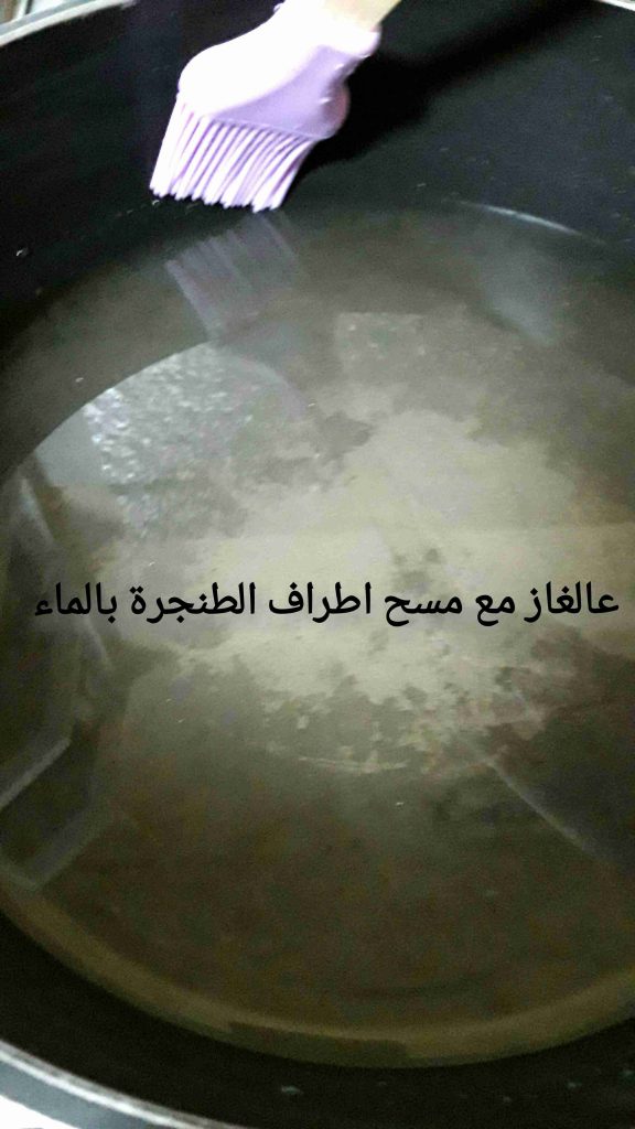 بعد ذوبان السكر بنرفع المحلول عالغاز نار حاميه طبعا وبفرشايه مبلولة مي بنمسح اطراف الطنجرة فوق مستوى السائل عشان نتخلص من اي سكر علق اثناء التذويب والتحريك. للغليان وبنوقف مسح.