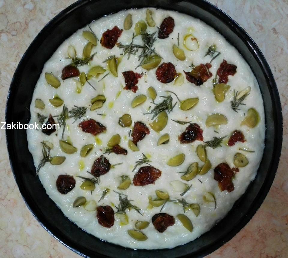 – و بعد الخمر نقوم بغرس اصابعنا فى العجينه لعمل حفر كثيره كل حفره نضع فيها قطعه زيتون والحفره التاليه قطعه طماطم مجففه ثم ثوم ثم اكليل الجبل و هكزا و نرش عليها زيت زيتون.