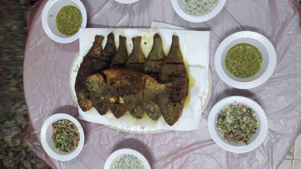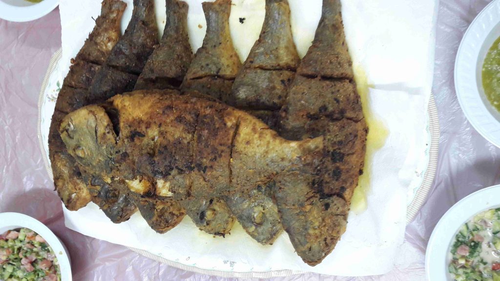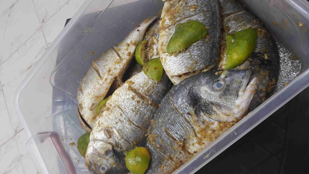 بنظف السمك من القشور وبغسلو بمي مزبوط وبنضف بطن السمكة من الداخل وبفرشاة اسنان بفركها من الداخل حتى تنضف وتصير بيضة بعد ما خلص من تنظيف الكمية كلها بحط بجاط مي وطحين وملح وبحط السمك في وبتركو نص ساعة وبعدين بفركو مزبوط بالمي والطحين وبقيمهم من المي والطحين وبغسلهم منيح وبعدين بحطو بمي وزيت زيتون وليمون وكمان بتركو شوي فيها وبعدين بغسلهم كتير منيح واخر اشي بتبلهم بالبهارات المذكورة والليمون وكمان نسيت احكيلكم انو لازم اشرح السمكة من الجهتين كل جهة ثلاث شرحات عشان تسهل دخول التتبيلة فيها وبترك السمك بالتتبيلة ليلة كاملة او من الصبح لوقت القلي