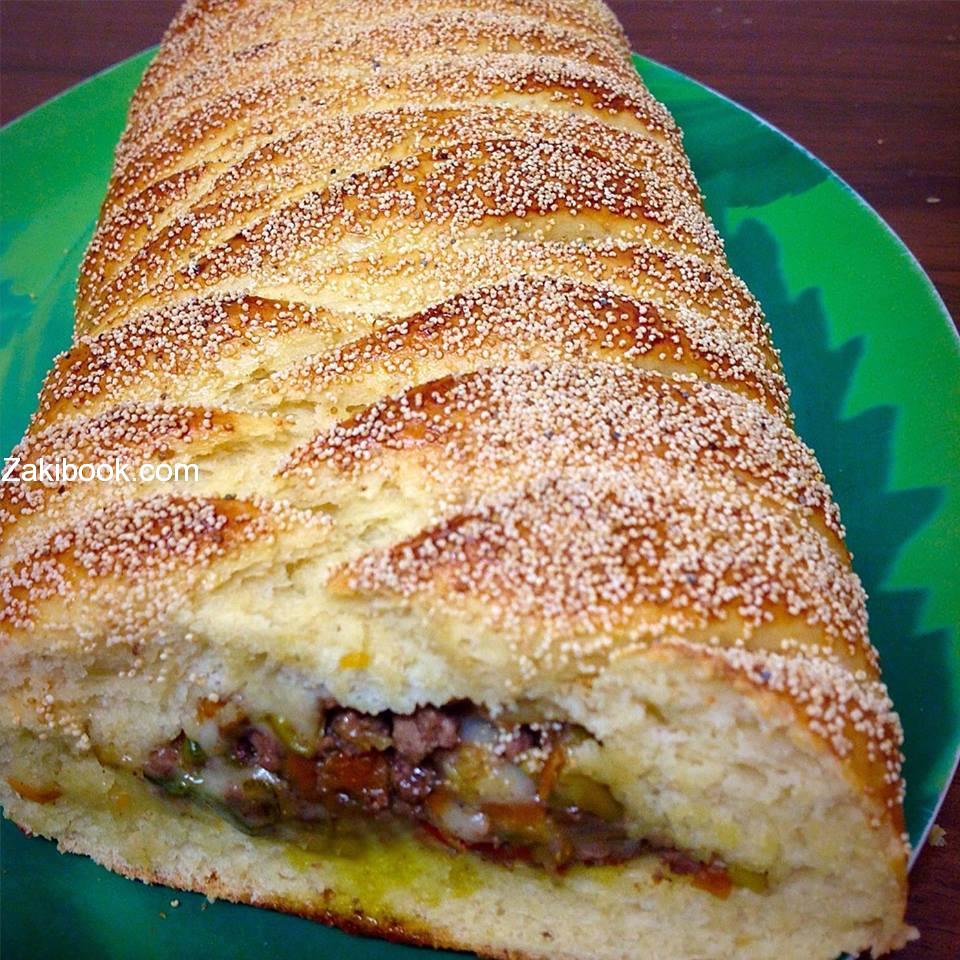 ونضعها في صينية مدهونة ، و تحشى بحشوة اللحم المفروم والفلفل ، ونغلقها بثني ظفائرها على بعضها ، كما هو موضح في الصورة .