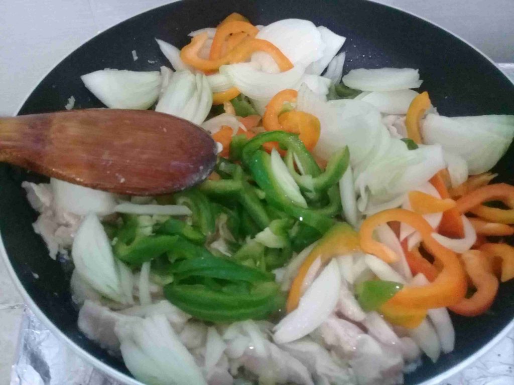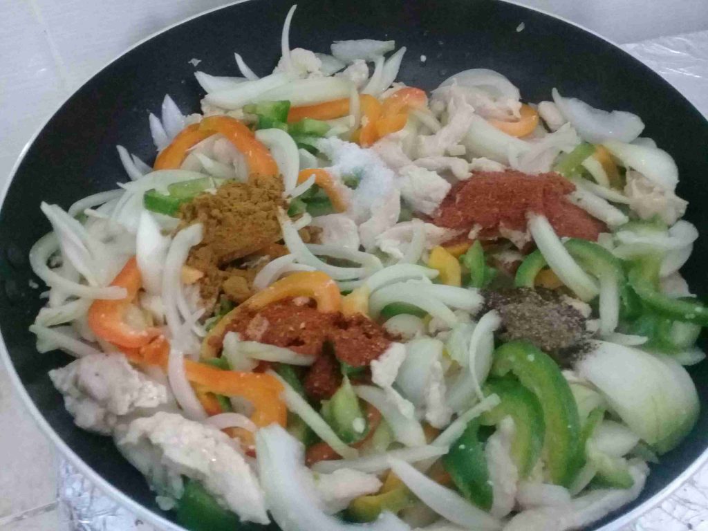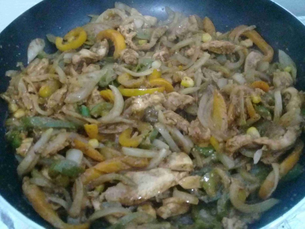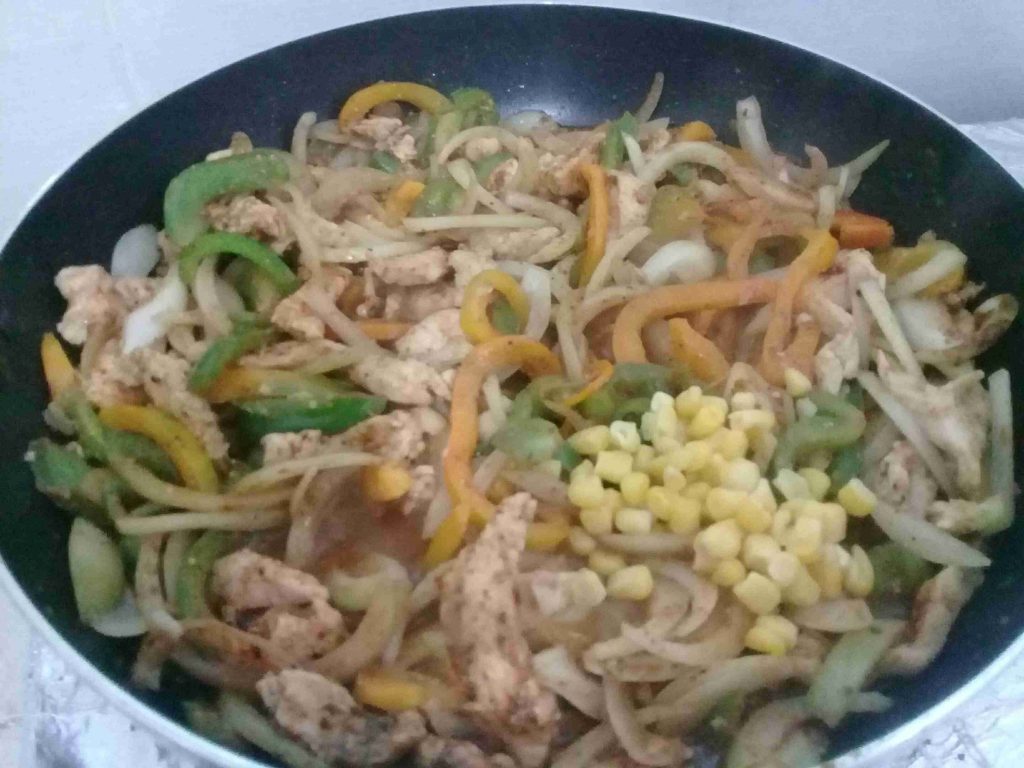 دقيت فصوص الثوم مع الزنجبيل سخنت المقلايه ضفت الزيت قلبت الثوم والزنجبيل لأخدو لون أشقر ضفت عليهم قطع الصدر وقلبتهم لأخدو تشويحه مع بعض ضفت الخضار وقلبت ضفت البهارات وحركت كويس ضفت الذره وتركتهم ليستو ويعيشوا اللحظه مع بعض ههههه