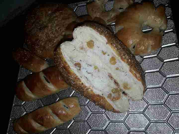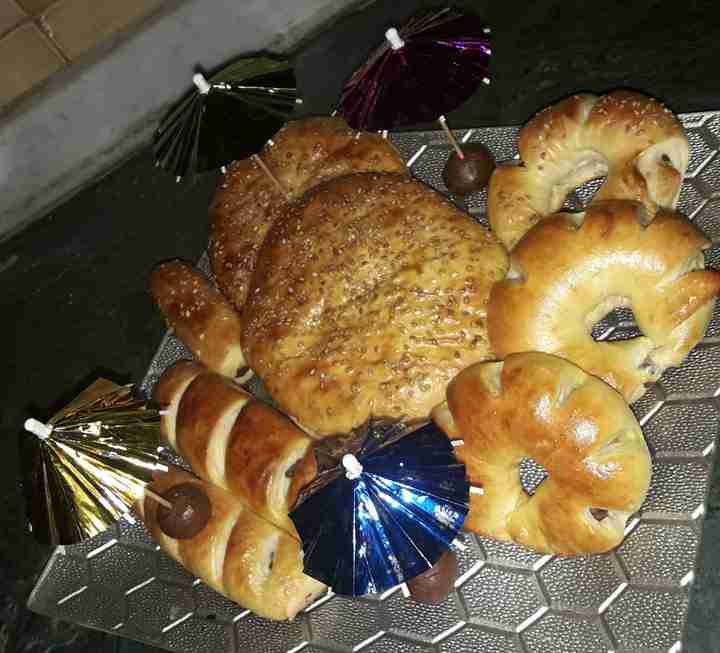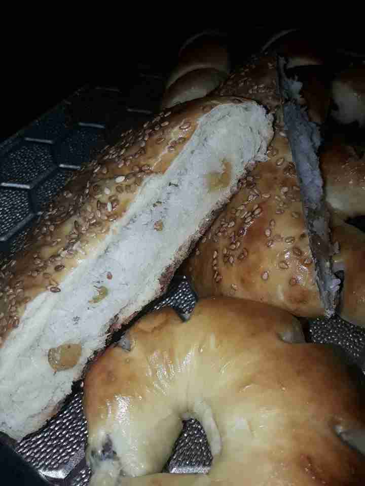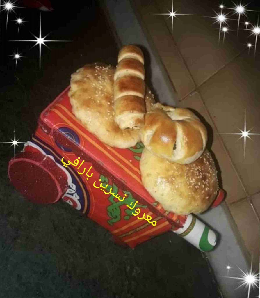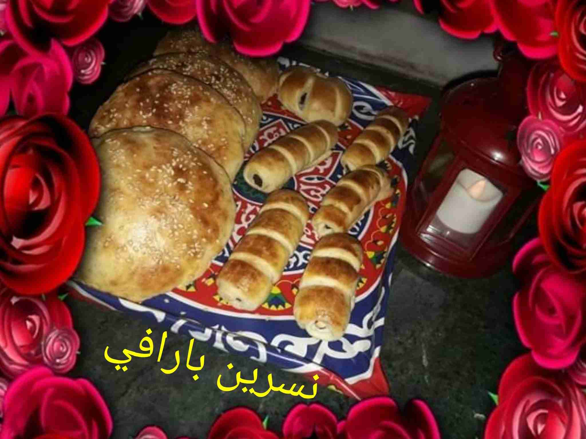 و الزيت + واللبن نعجنهم جيدا لتتشكل عجينة ونتركها تختمر ٣٠ دقيقة ثم نقسمها ٦ كرات متساوية ونفردها بحيث ماتكون رقيقة جدا ونضعها بصينية الفرن تحتها ورق زبدة ونحشيها بجوز الهند والزبيب والقطر ونضغط عليهم بيدنا ونضع فوقهم طبقة تانية ونسكرها لتحت وندهن الوجه ونرش السمسم ونغطيهم ونتركهم يختمرو مدة ١٥ دقيقة وندخلها ع فرن محمى مسبقا ع حرارة ١٨٠ درجة مدة ٢٠ دقيقة حسب الفرن ثم نحمرها من فوق لياخدو لون ونطلعهم ونغطيهم ثم يقدم والف صحة وهنا