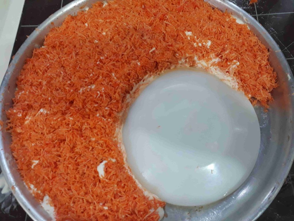 أكسر الكنافة بيدي الى ان تصبح ناعمة واضيف السمنة وافركها جيدا الى ان تتغطى جيدا…اضيف اللون البرتقالي بعد ما خلطته مع الماء وافرك به الكنافة الى ان تاخذ اللون البرتقالي كله….