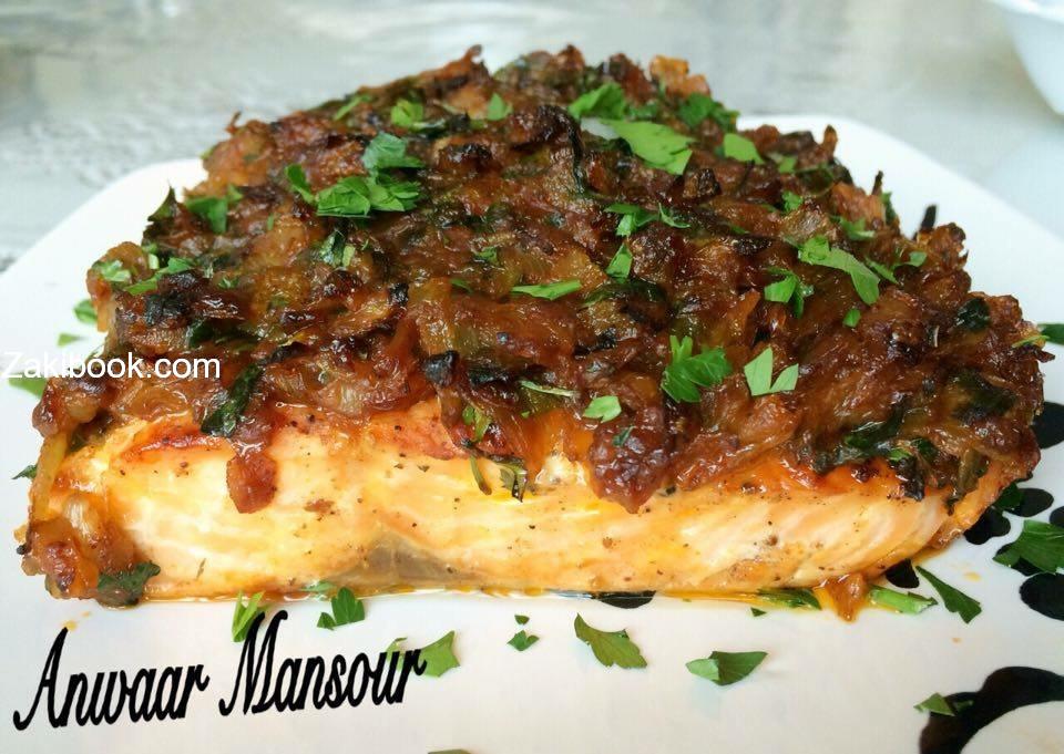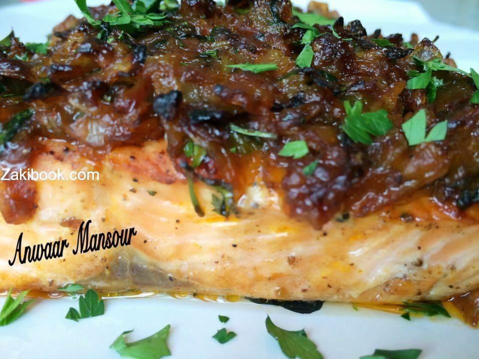 سمك السلمون مع تتبيله البصل وجبه صحيه وبطريقه تختلف عن الطرق التقليديه تابعو الطريقه مع فنانتنا الشيف انوار منصور