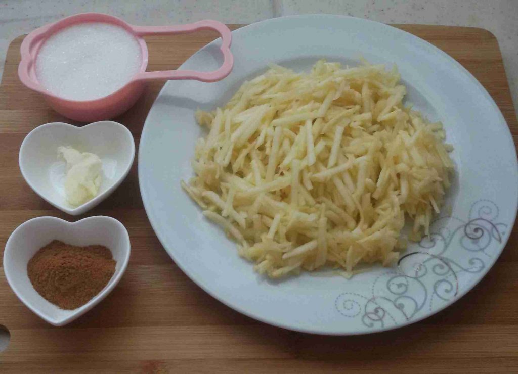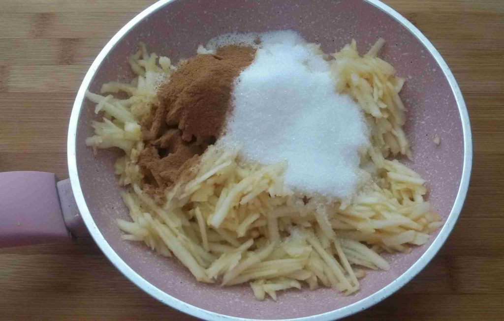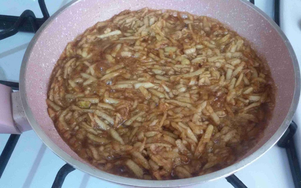 أول خطوة منعملها منحط التفاح المبروش مع السكر والقرفة والزبدة عالنار ومنقلبهم مع بعض ليدوب السكر ويتكرمل التفاح شوي متل مو شايفين