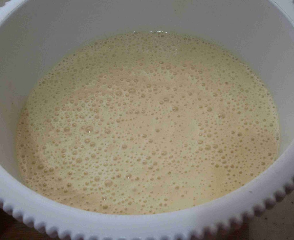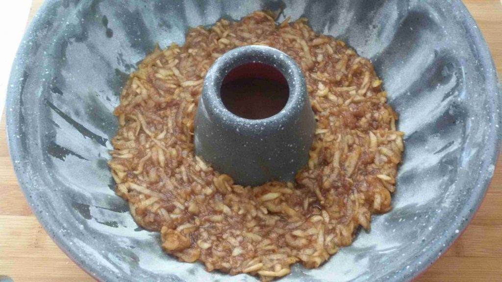 المهم بس نخلص خلط الطحين بهدوء مع مزيج البيج منضيف ملعقة الخل للمزيج آخر شي ومنخلطها معو كمان ومنصب هالخليط الحبوب فوق برش التفاح المكرمل