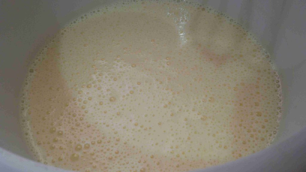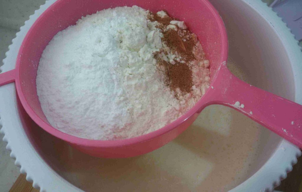 منخفق البيض مع السكر والفانيليا منيح ليفتح لون البيض منضيف بعدها الحليب والزيت ومنخلطهم وبعدها مننخل الطحين والقرفة والملح والبيكينغ باودر بس بالتدريج مشان مايهبط خليط البيض ولينتشر الطحين في كل مكان