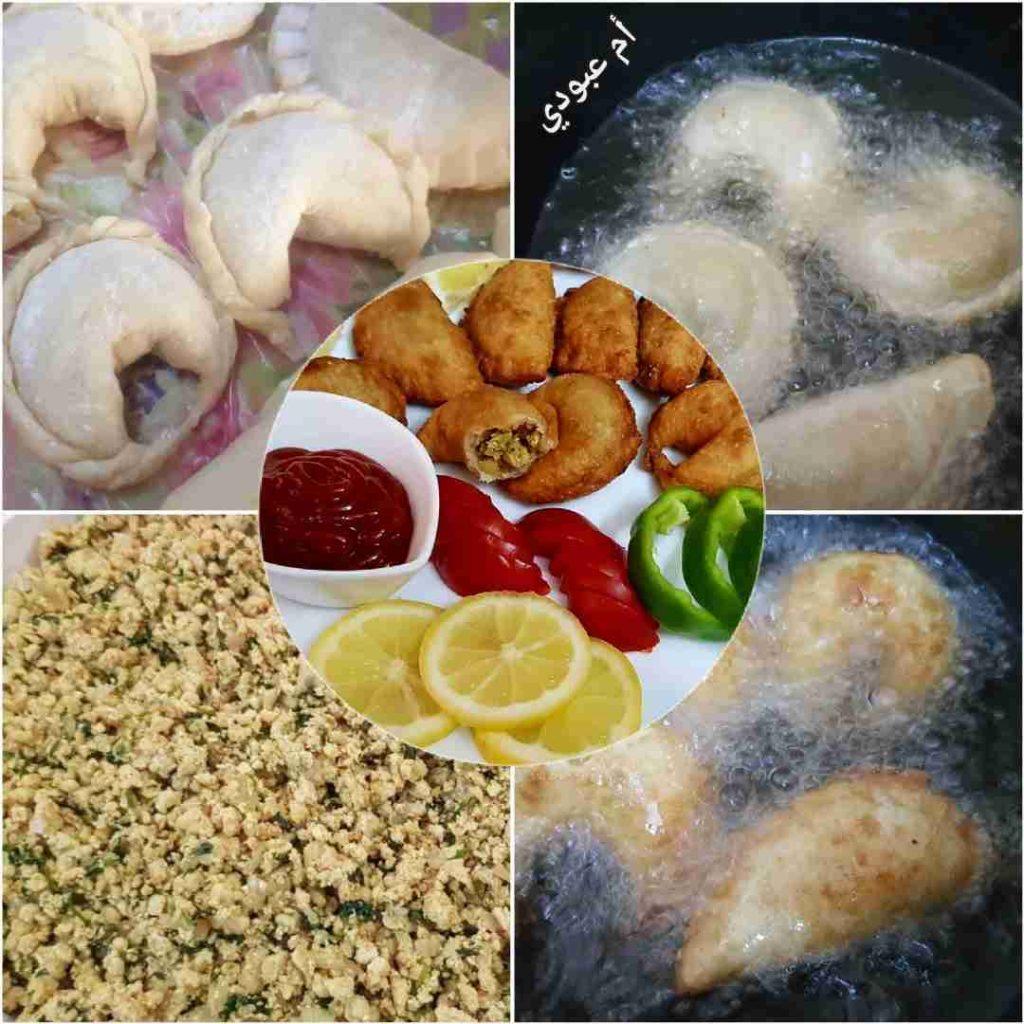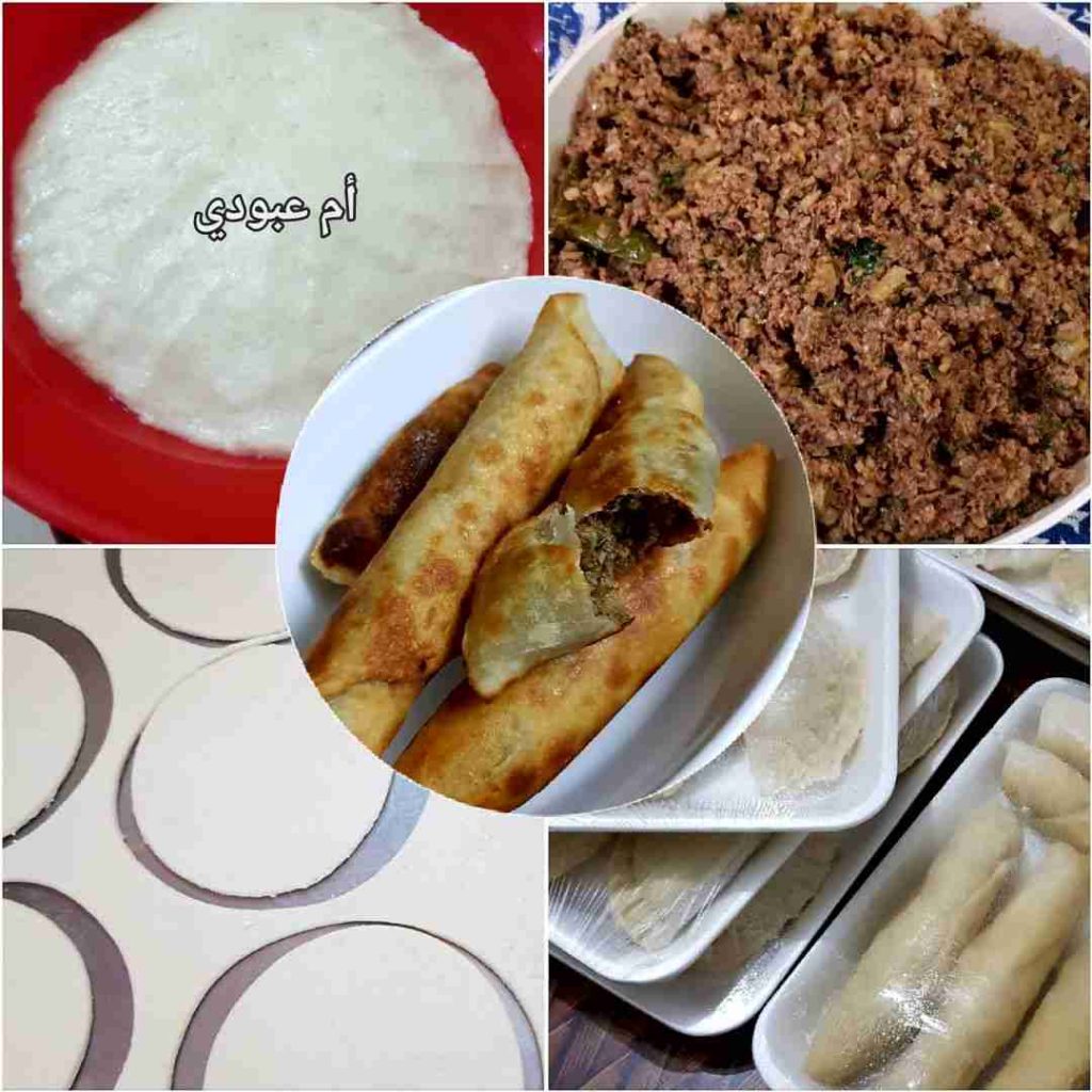 للعجينه. ٣ أكواب ماء. ٣ملاعق زيت. رشة ملح. نضعهم في قدر ع النار حتى يغلي. بعدها نضيفله تقريبا كيلو طحين و نطفي و نبدي نخلط جيداً بمعلقه خشب و نعجن و نفرغه و نبدي نعجن بالتدريج حتى تبرد و ندعكها جيداً…( إذا احتجنا ماء أو طحين ممكن نزيدها حتى نحصل على عجينه ناعمه و متماسكه) نغطيها و نتركها نصف ساعة ترتاح ثم نبدي نفردها بالنشأ و نحشيها و نلفها و نرش عليها رشة نشأ. و نحفظها بالفريز.(النشأ حتى يخليها مقرمشه و ما تشرب زيت)..